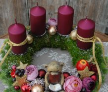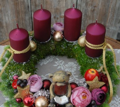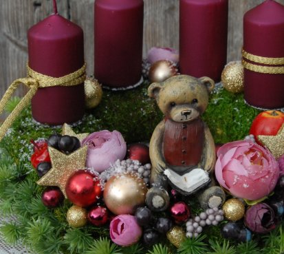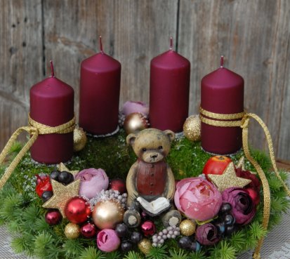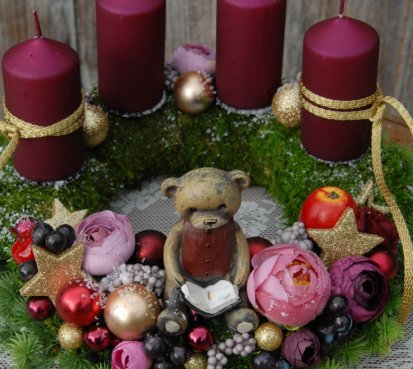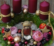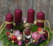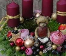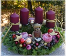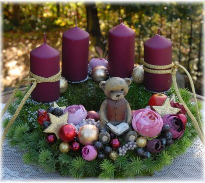 Dekorace je vytvořena na pevném mechovém korpusu, bohatě zdobena vánočními přízdobami, svíčky na bezpečnostních bodcích jsou vyměnitelné.....na vše dohlíží krásný medvídek z polyresinu