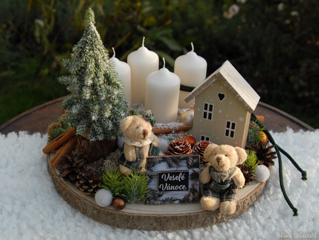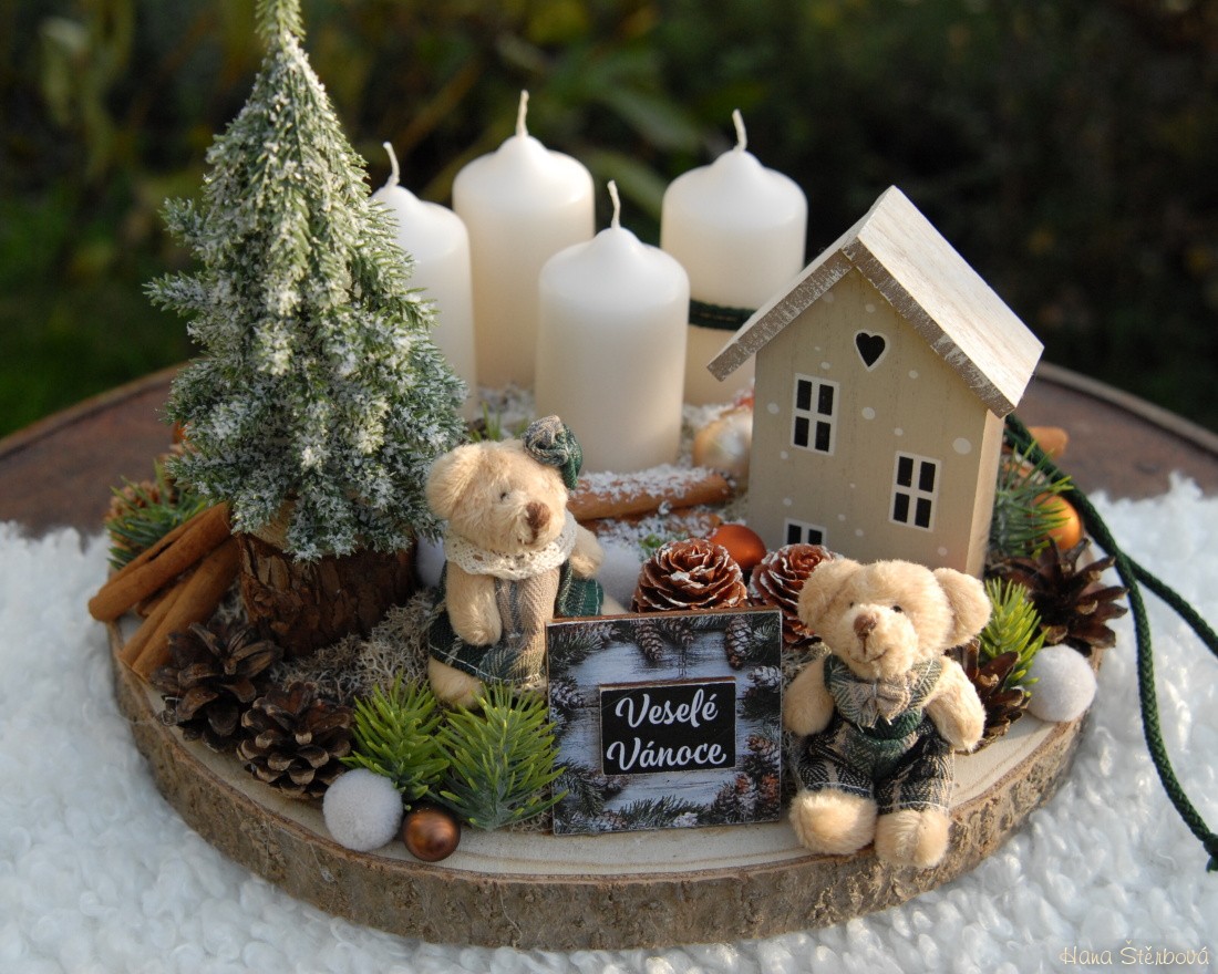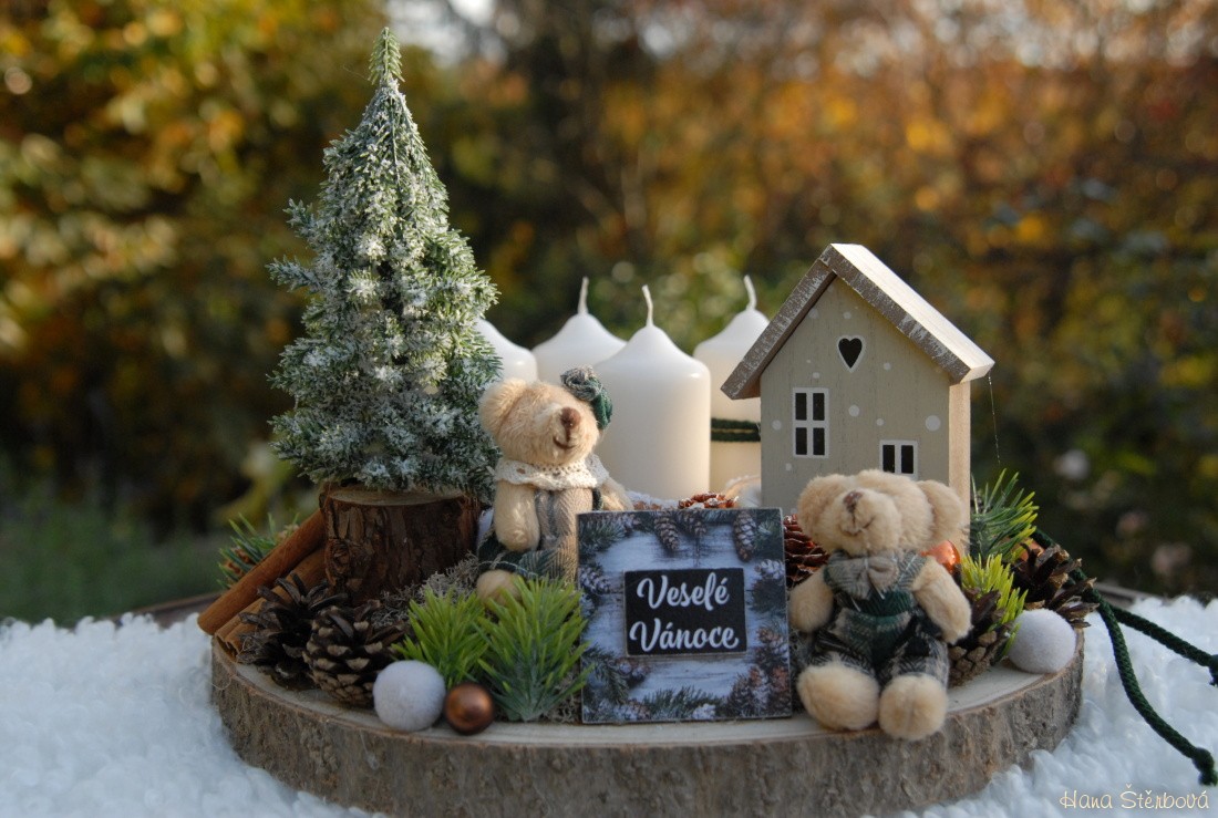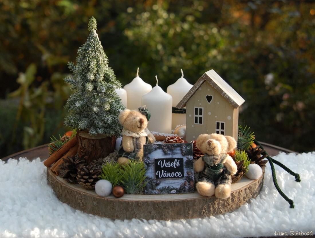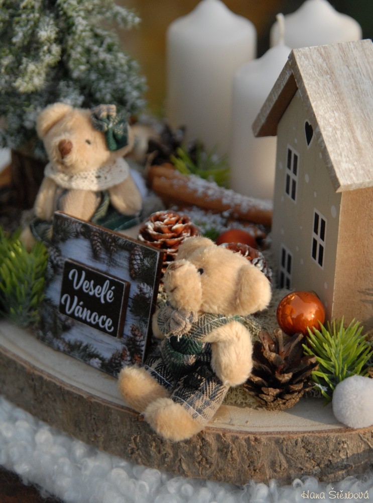 Bohatě zdobená dekorace na dřevěné kulatině vánočními přízdobami, přírodninami, dřevěným domečkem a dva krásní medvídci k tomu..