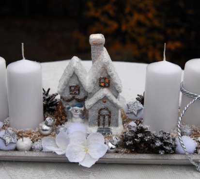 Dekorace je vytvořena na dřevěném podnosu, svíčky na bezpečnostním bodci jsou vyměnitelné...domeček za šera svítí