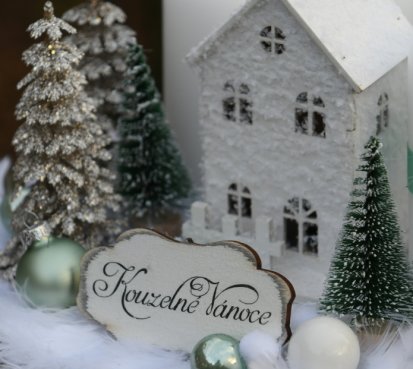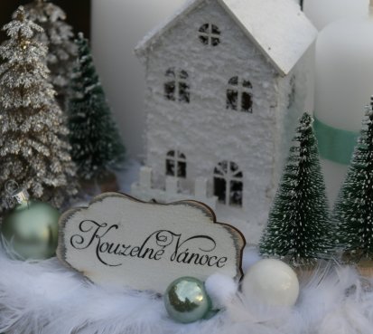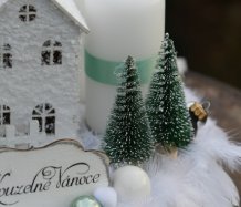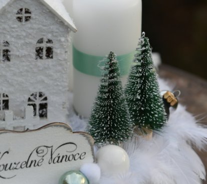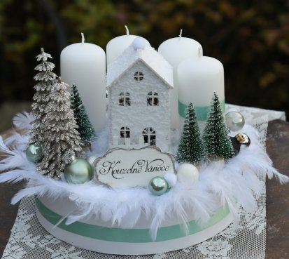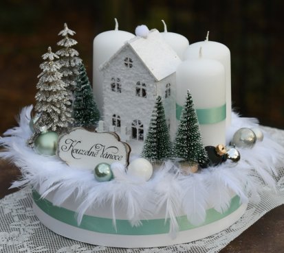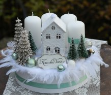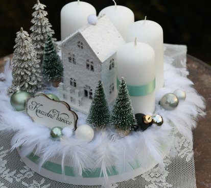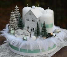 Adventní dekorace se spoustou vánočních přízdob, svíčky jsou vyměnitelné na bezpečnostních bodcích.....krásný zasněžený domeček s led světýlkem k tomu