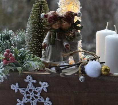 Dekorace je naaranžována do dřevěné bedýnky se spoustou vánočních přízdob, jeden ze stromečků za šera svítí (baterky jsou přiloženy). Dodávám ještě 4 kusy náhradních svíček