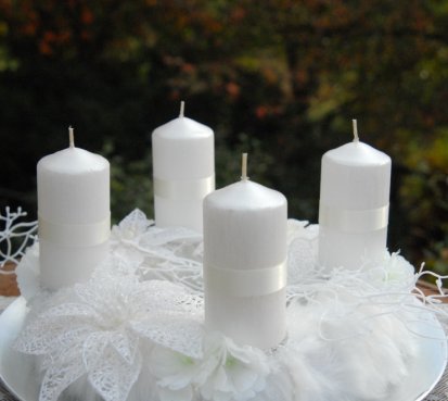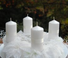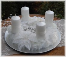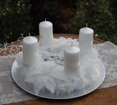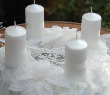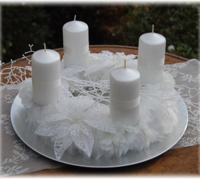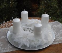 Korpus věnce je vytvořen z bílé kožešiny, ozdoben omrzlými květinami, svíčky na bezpečnostních bodcích jsou vyměnitelné. Celá dekorace je umístěna na stříbrném podnosu