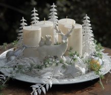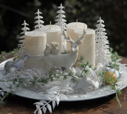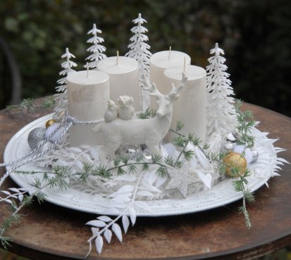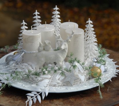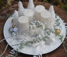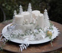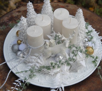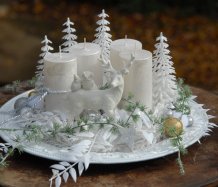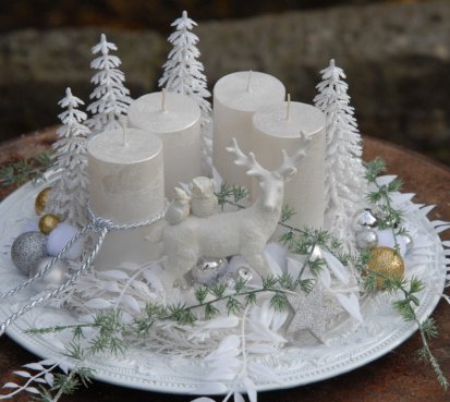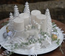 Luxusní dekorace je naaranžována na krásném zdobeném talíři, svíčky na bezpečnostních bodcích jsou vyměnitelné, spousta vánočních přízdob a k tomu krásný bílý jelen z polyresinu