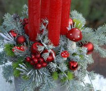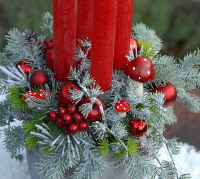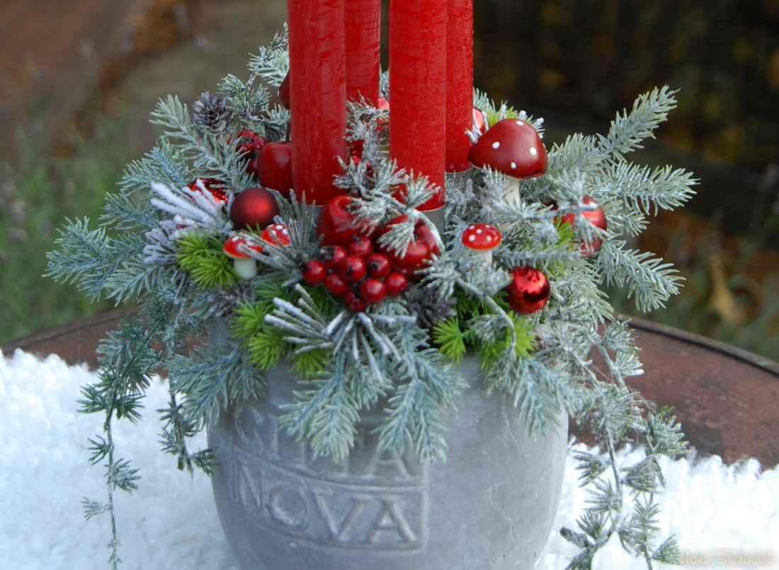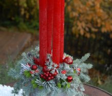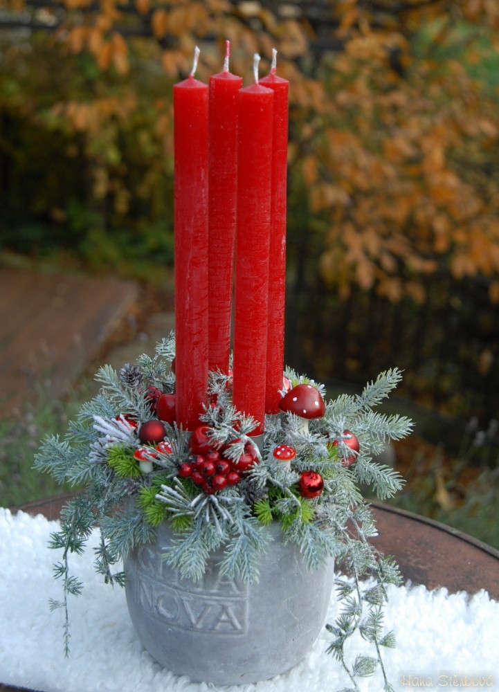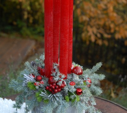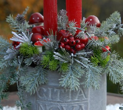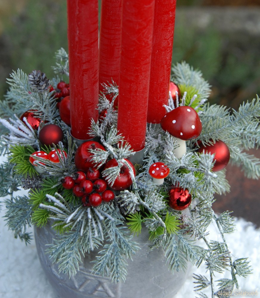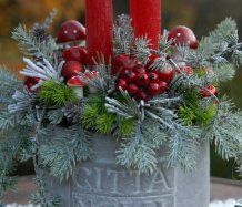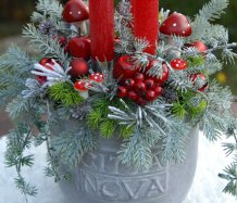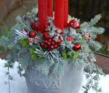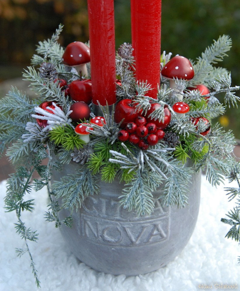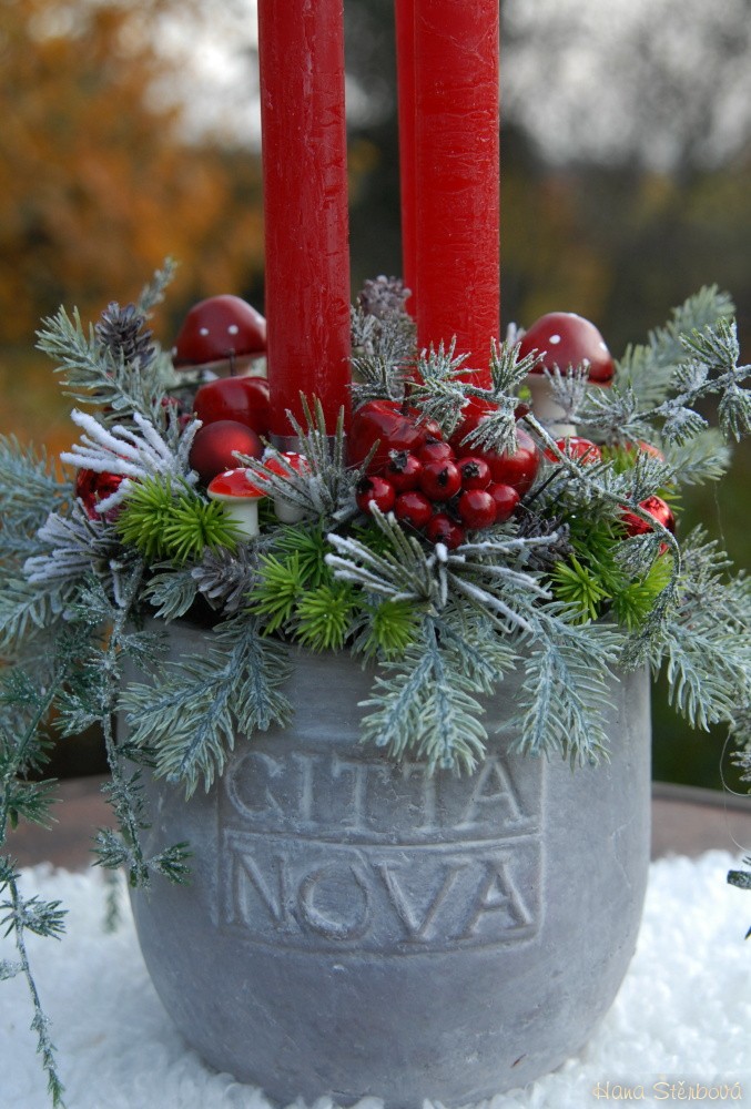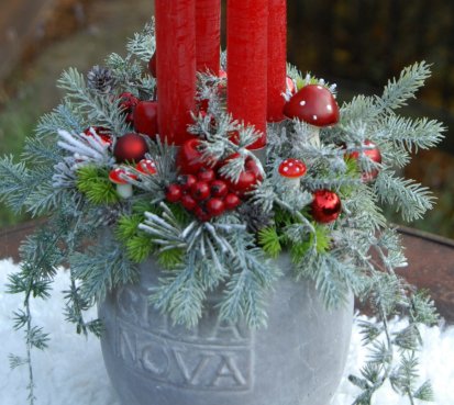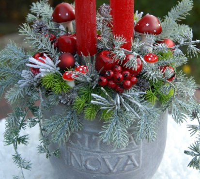 Dekorace je zasazena do luxusní keramické nádoby s krásným umělým jehličím, vánočními přízdobami