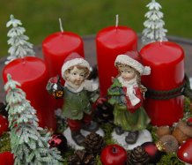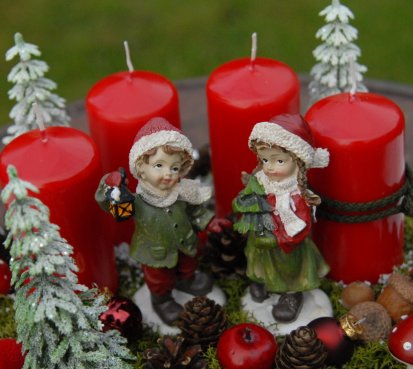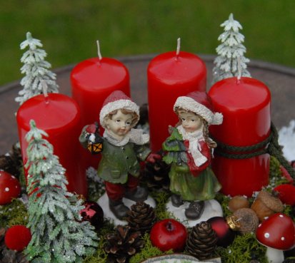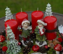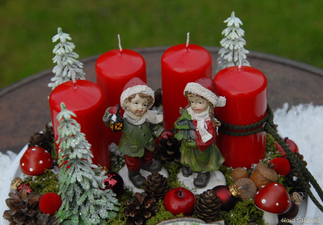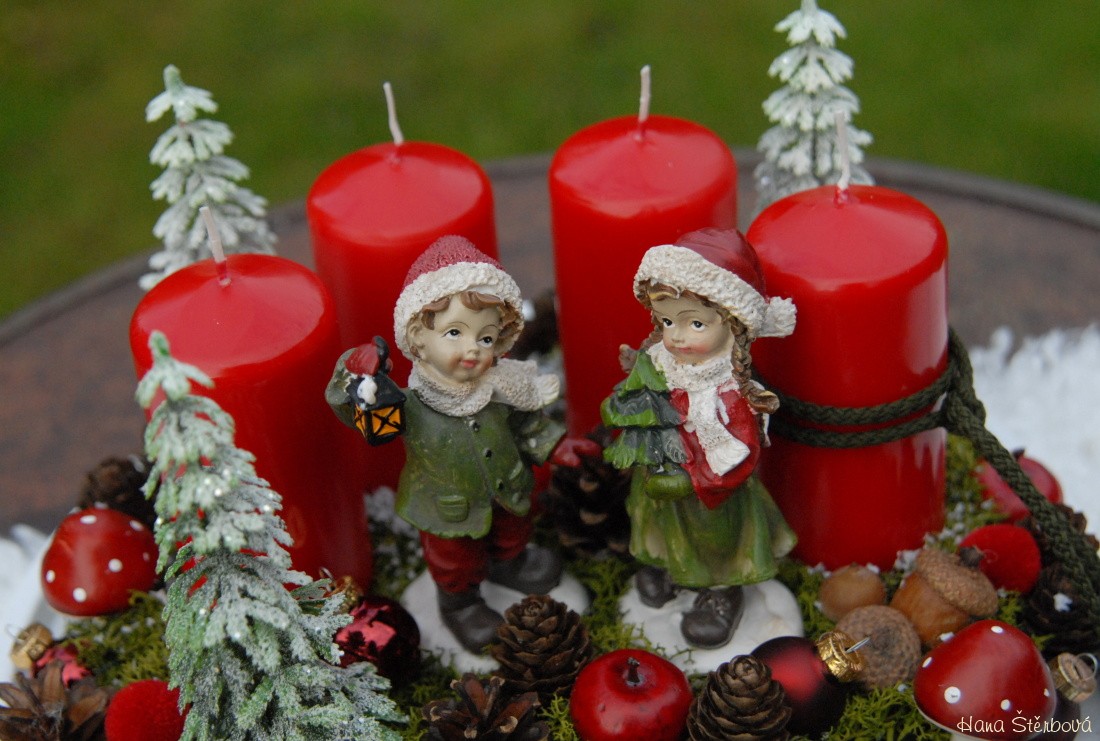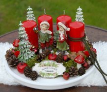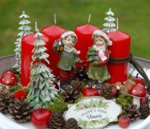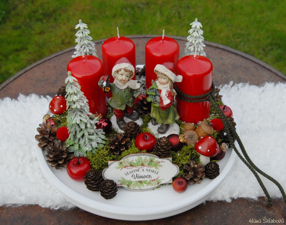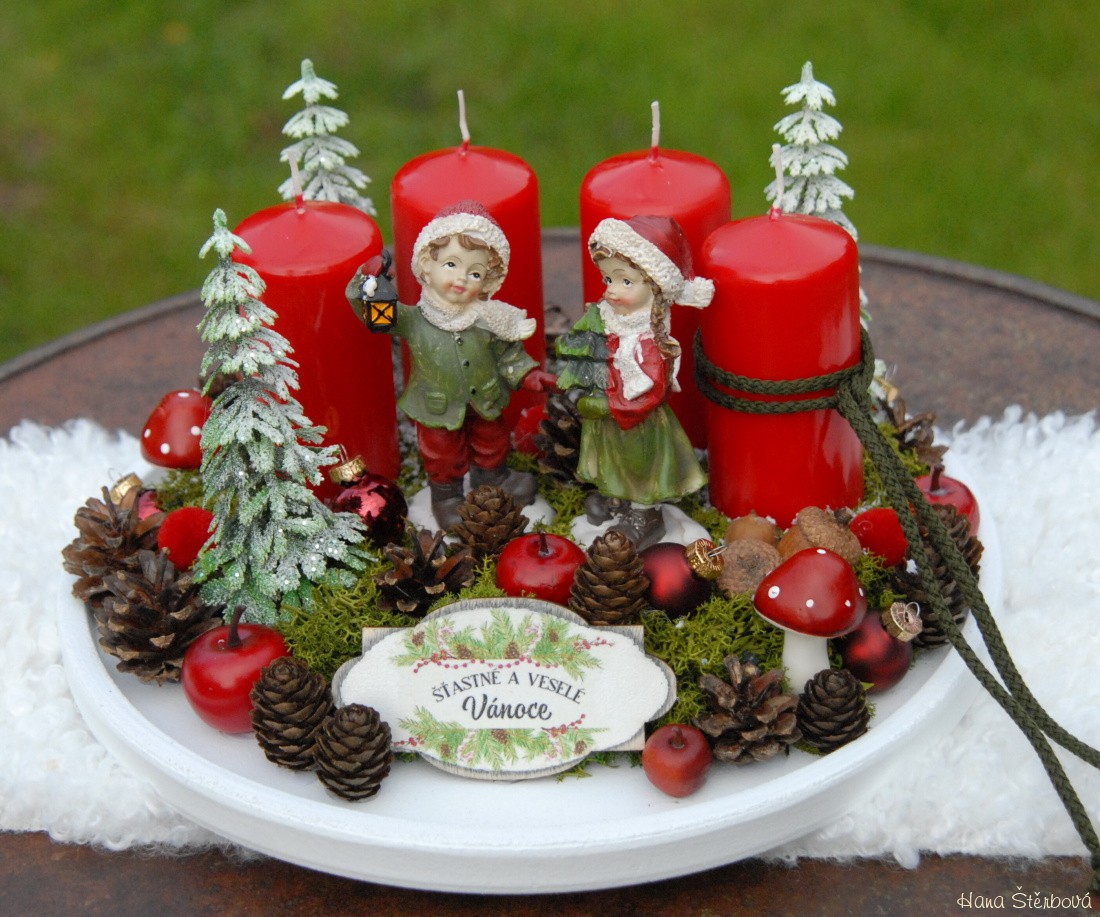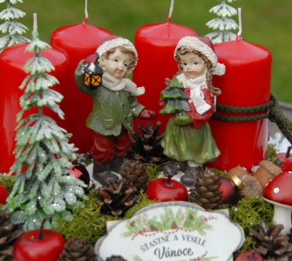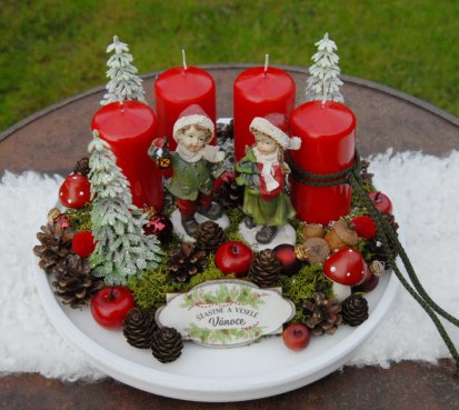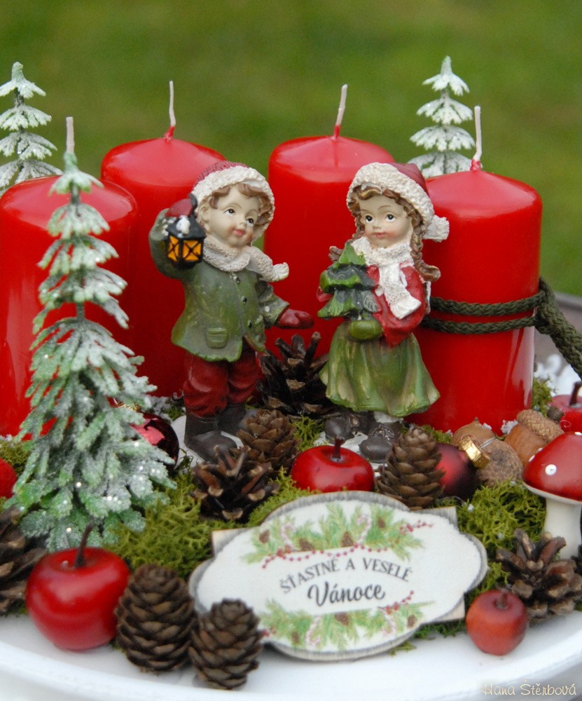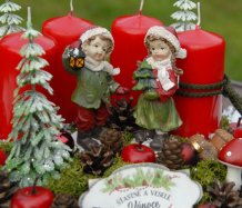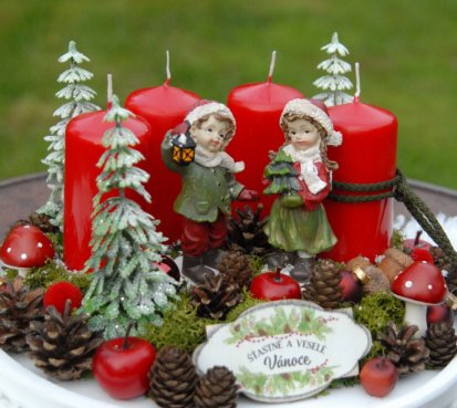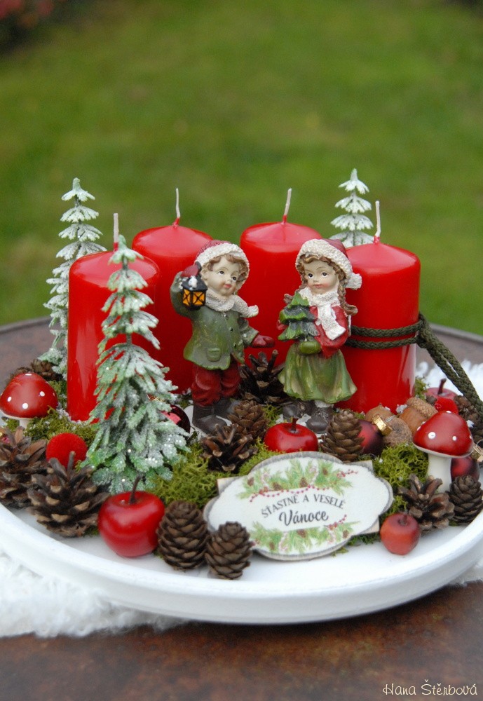 Dekorace je naaranžována na dřevěném podnosu s velkým množstvím vánočních přízdob....dvě krásné dobové figurky k tomu