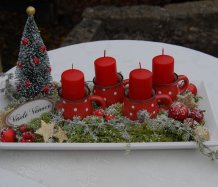 Podlouhlá dekorace je naaranžována na dřevěném podnosu se spoustou vánočních přízdob. Porcelánové hrníčky jsou volně naaranžované, svíčky lze měnit
