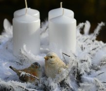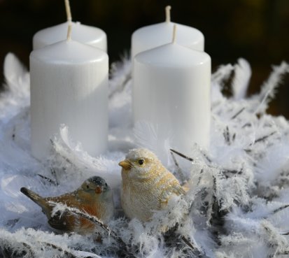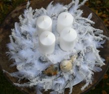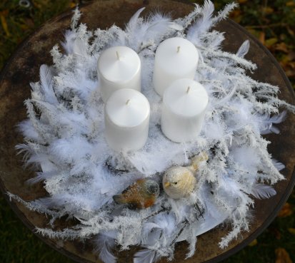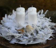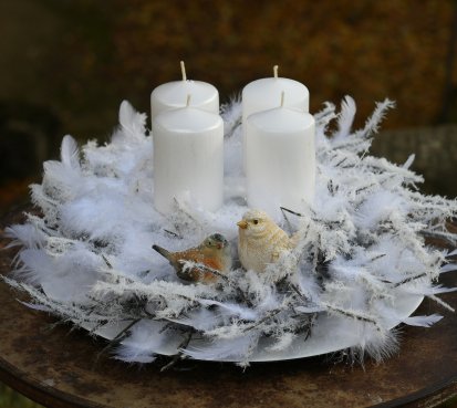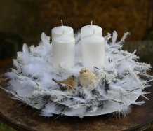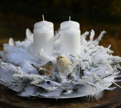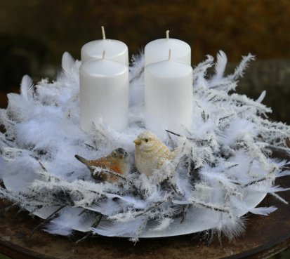 Velká dekorace je naaranžována na bílém tácu s množstvím umělých zasněžených větviček a peříček....dva krásní ptáčci z polyresinu k tomu