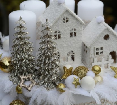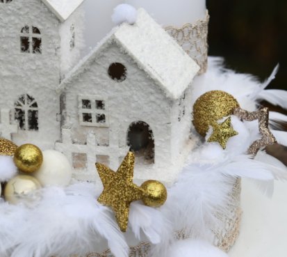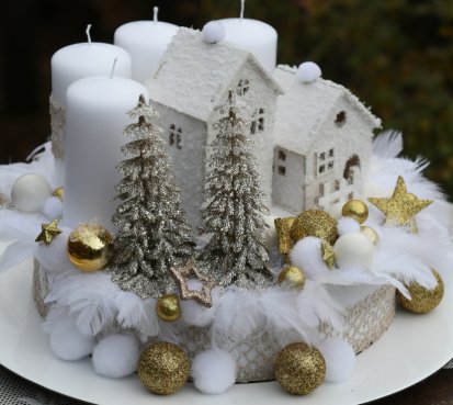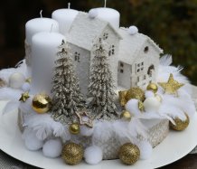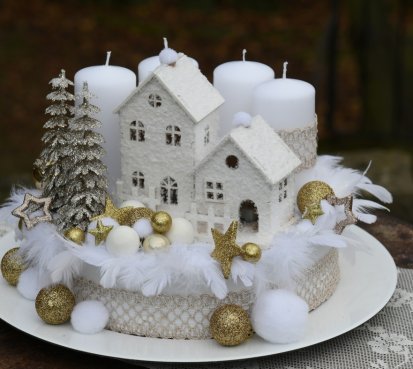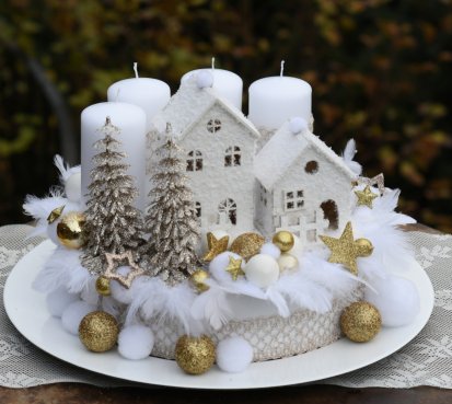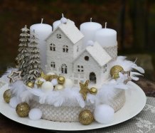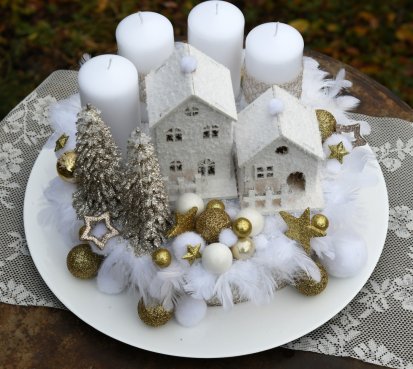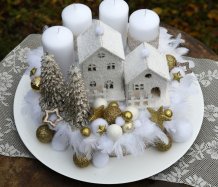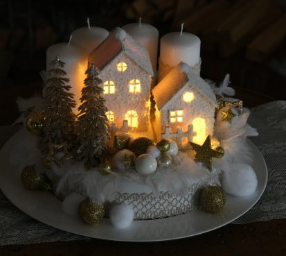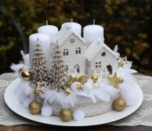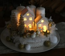 Dekorace je umístěna na krásném bílém talíři, bohatě zdobena vánočními přízdobami, svíčky na bezpečnostních bodcích jsou vyměnitelné. Dva krásné svítící domečky s led světýlky k tomu.