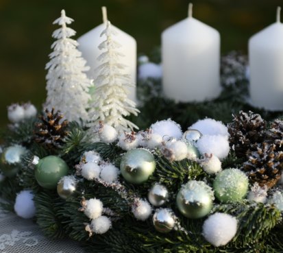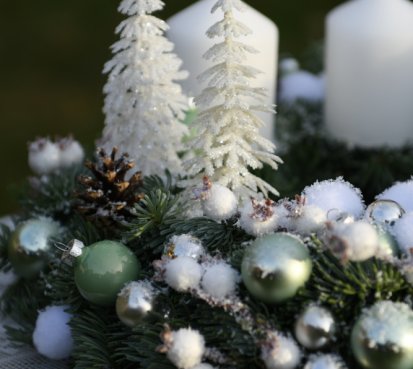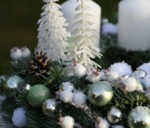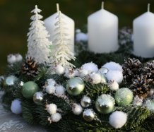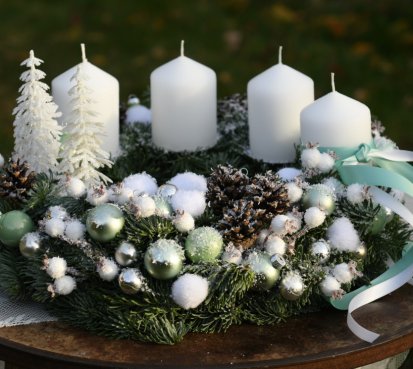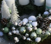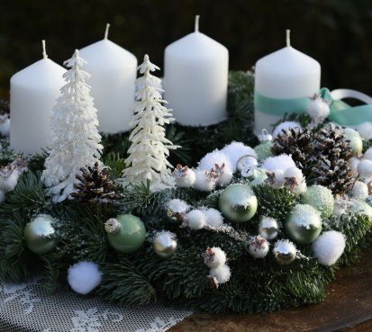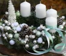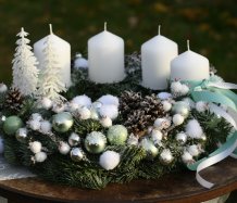 Velikánský mohutný věnec z čerstvé jedle Nobilis je bohatě zdoben vánočními přízdobami v mint barvičkách, šiškami. Svíčky na bezpečnostním bodci jsou vyměnitelné