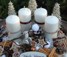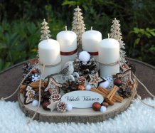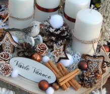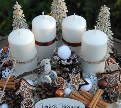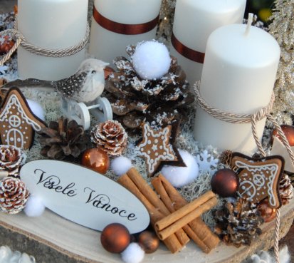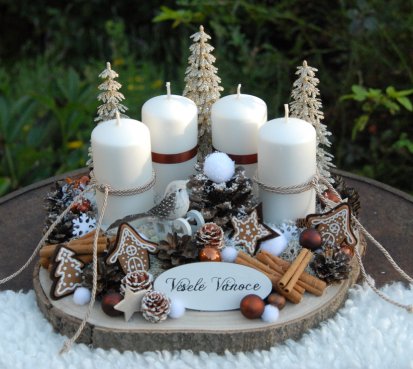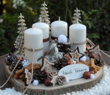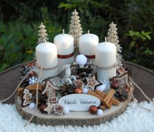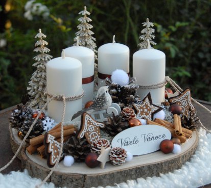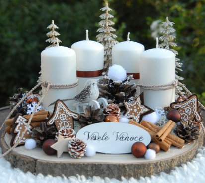 Dekorace s velkým množstvím vánočních přízdob a přírodnin je naaranžována na dřevěné kulatině....krásné perníčky jsou z filcu, svíčky na bezpečnostních bodcích jsou vyměnitelné