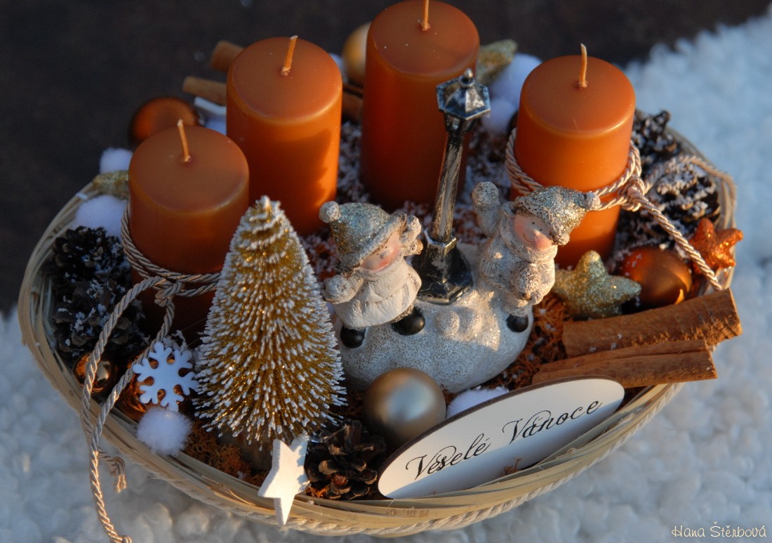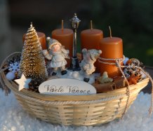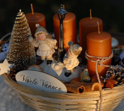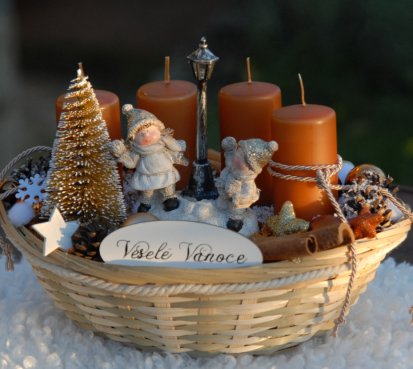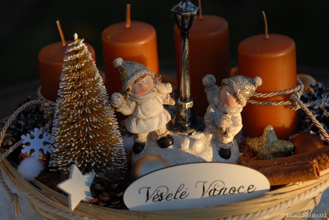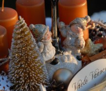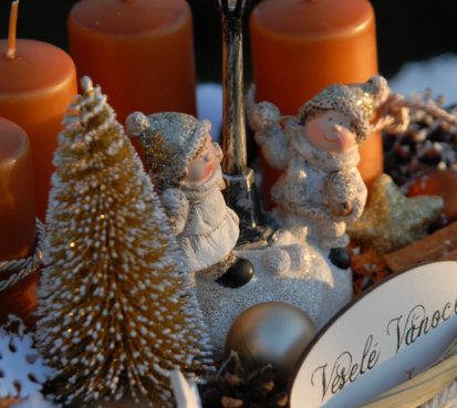 Bohatě zdobená dekorace vánočními přízdobami a krásnými figurami z polyresinu
