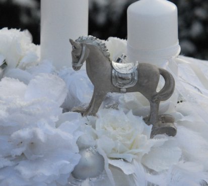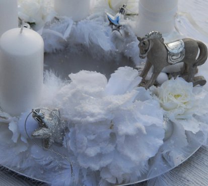 Bohatě zdobený adventní věnec na stříbrném podnosu, svíčky na bezpečnostních bodcích jsou vyměnitelné...a krásný koník k tomu
