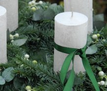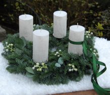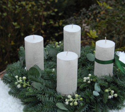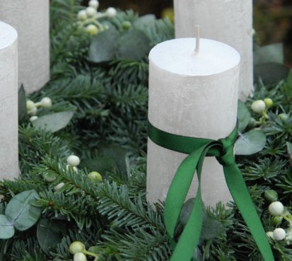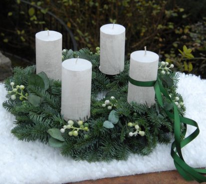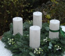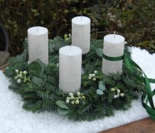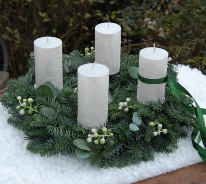 Věnec je umotán z čerstvé jedličky, zdoben stabilizovaným eukalyptem...svíčky na bezpečnostních bodcích jsou vyměnitelné