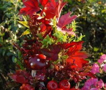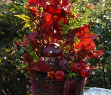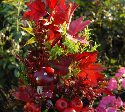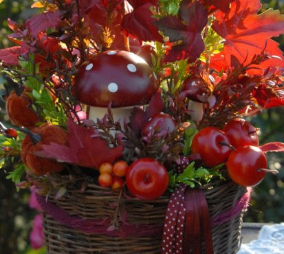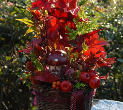 Velká podzimní dekorace v proutěném koši, bohatě zdobená umělými květinami a plody