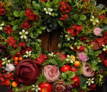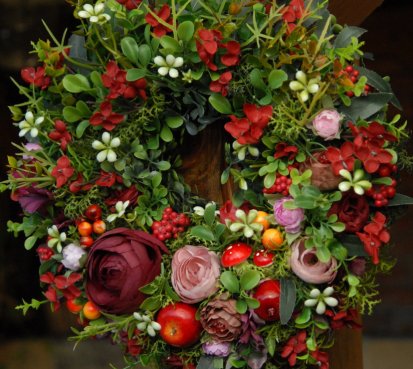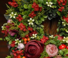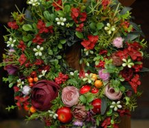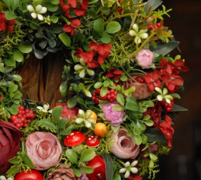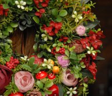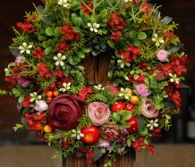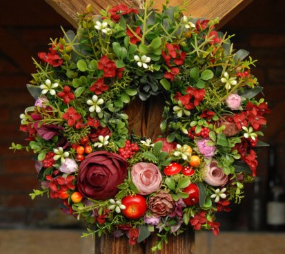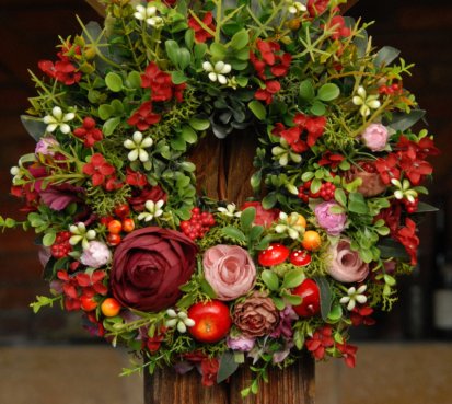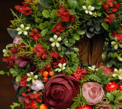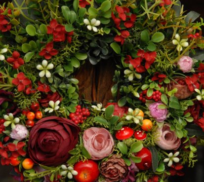 Bohatě zdobený věnec dokonalými umělými květinami a plody