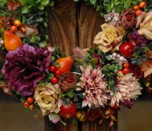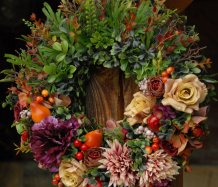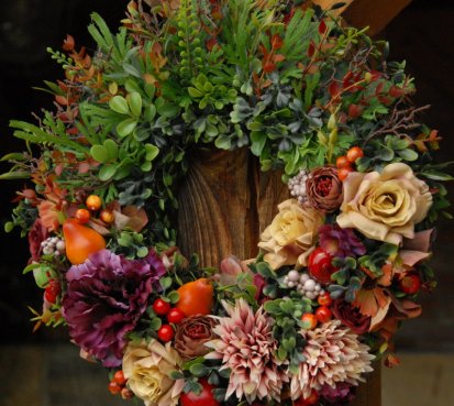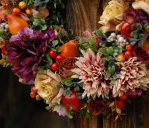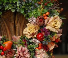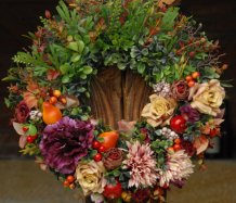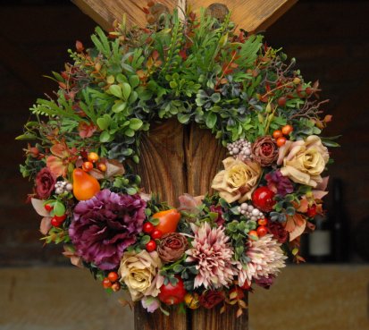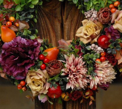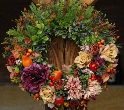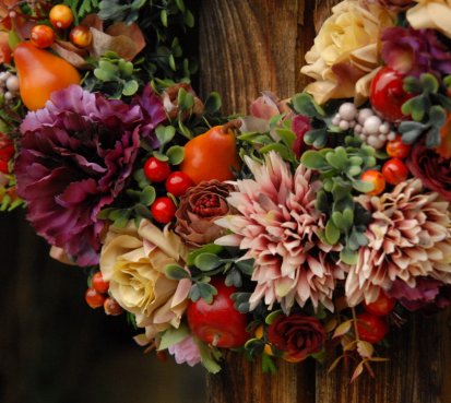 Bohatě zdobený věnec dokonalými umělými květinami a plody