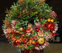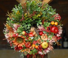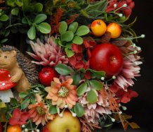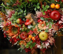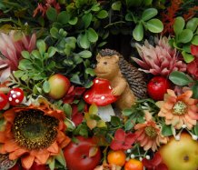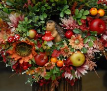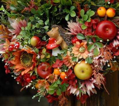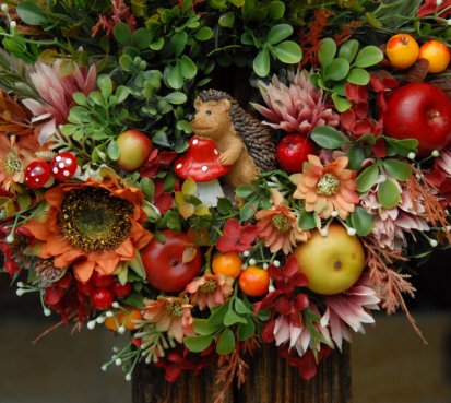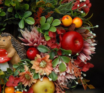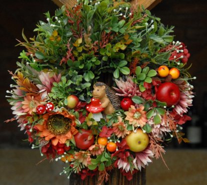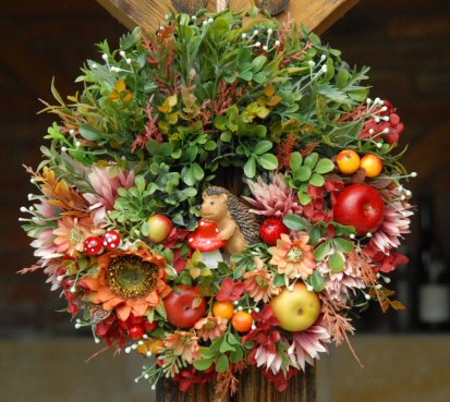 Bohatě zdobený podzimní věnec dokonalými umělými květinami....na vše dohlíží roztomilý ježek