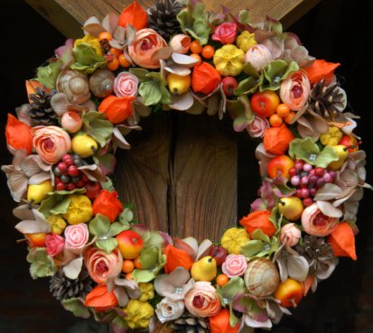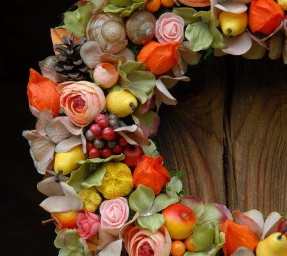 Veliký mohutný věnec je bohatě zdoben krásnými látkovými pryskyřníky, hruškami, jablky....krásná podzimní dekorace do Vašeho domova