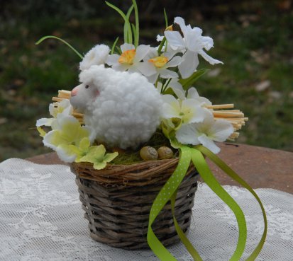 Roztomilá jarní dekorace s beránkem v proutěném košíku