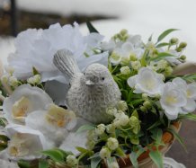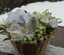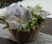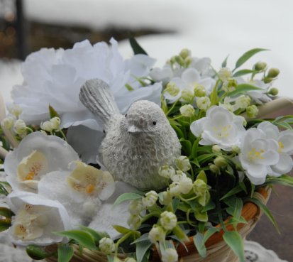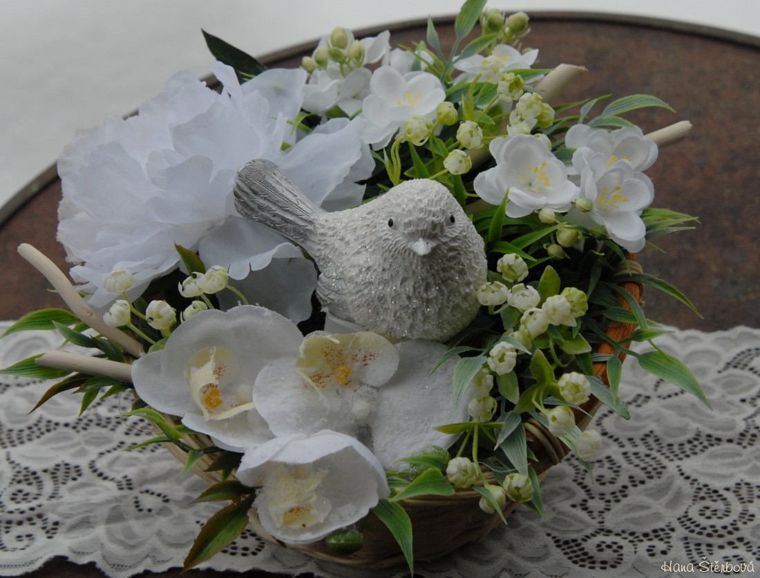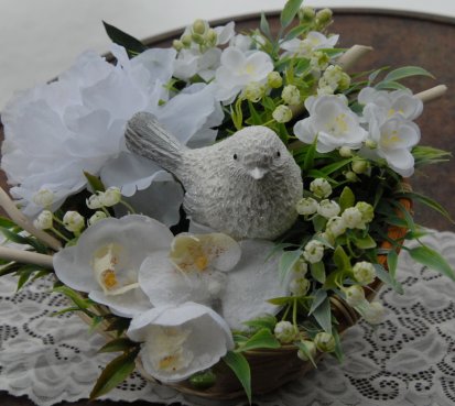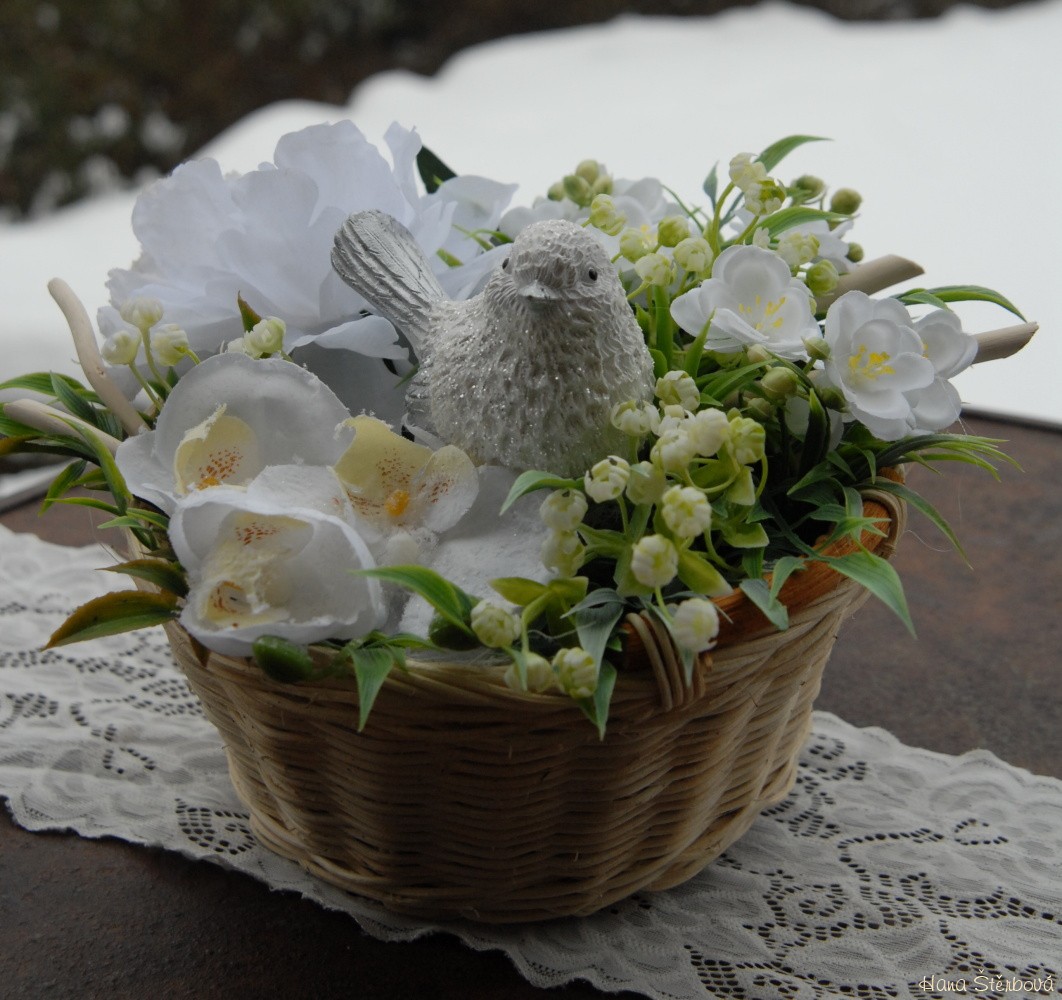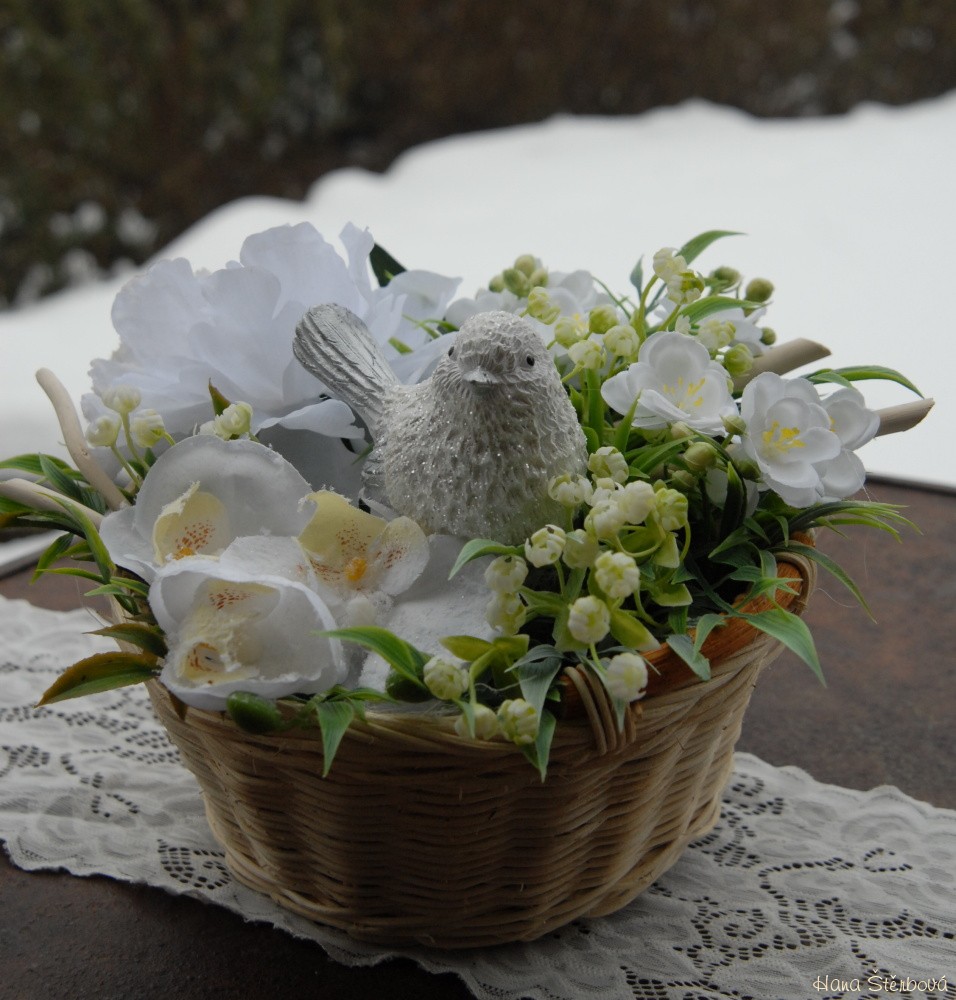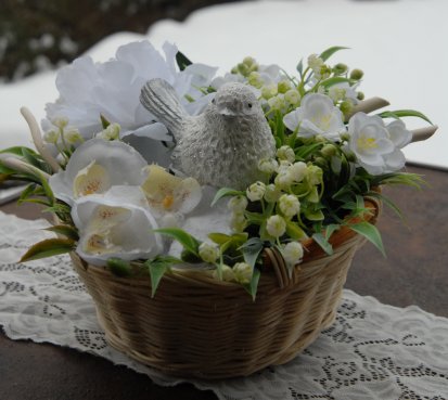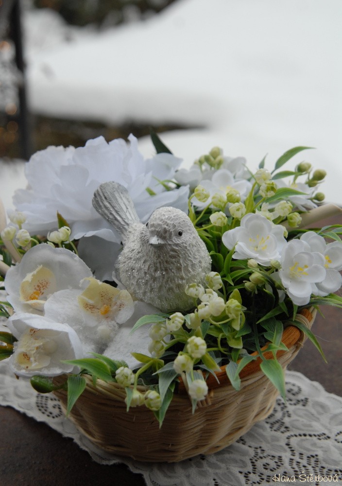 Dekorace z dokonalých umělých květin s krásným ptáčkem z polyresinu .....je myšlena jako dekorace ze zimy do jara
