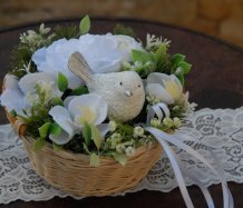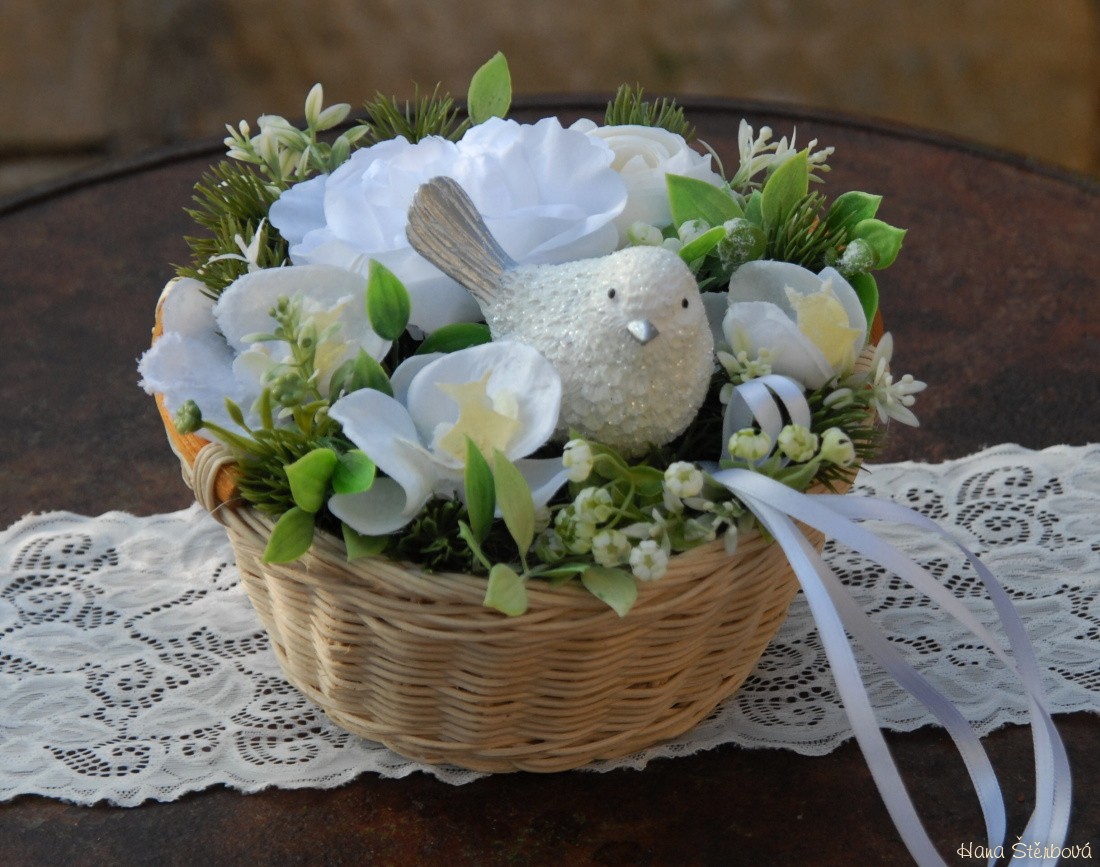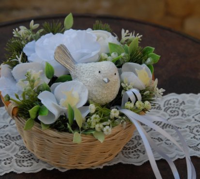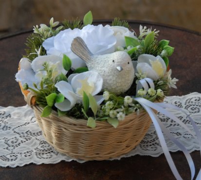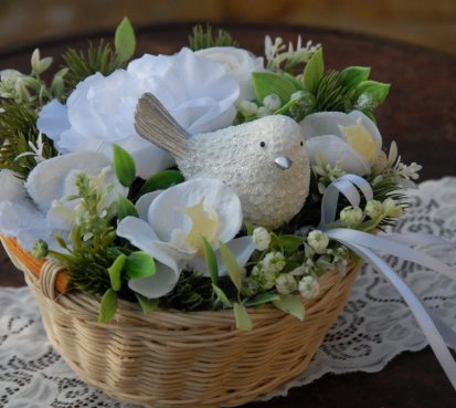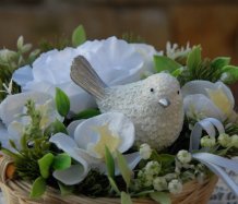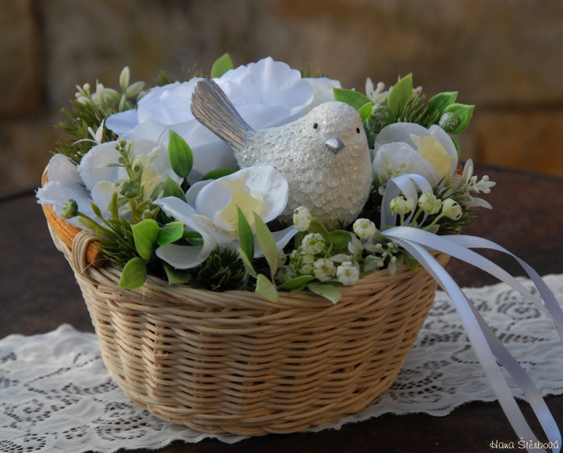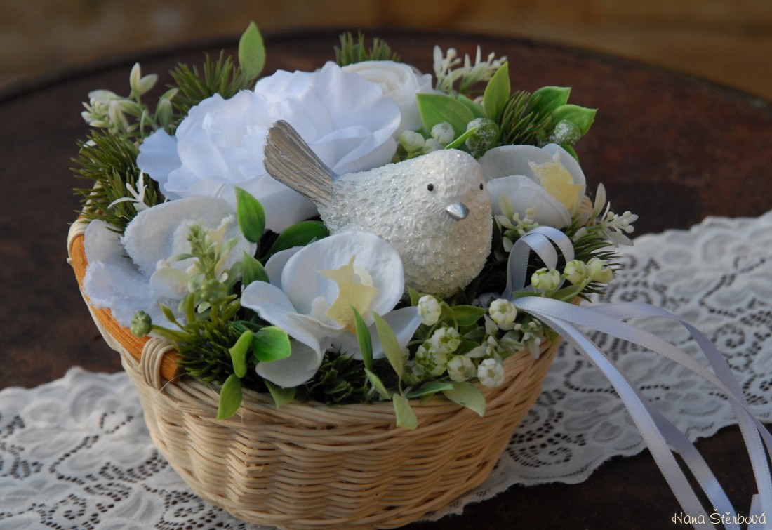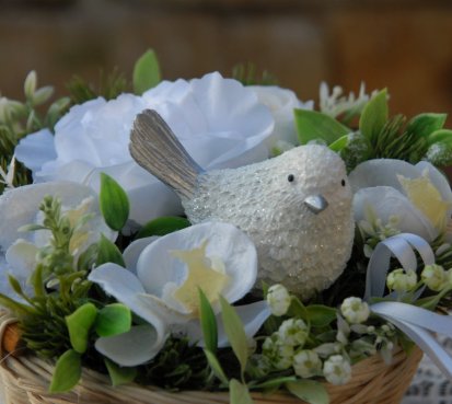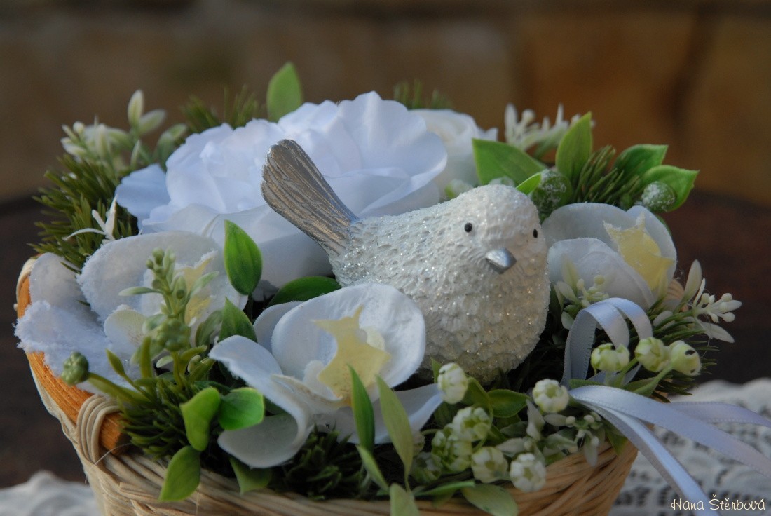 Dekorace z dokonalých umělých květin s krásným ptáčkem z polyresinu .....je myšlena jako dekorace ze zimy do jara