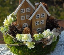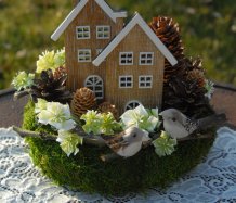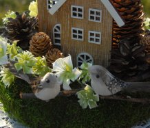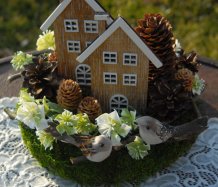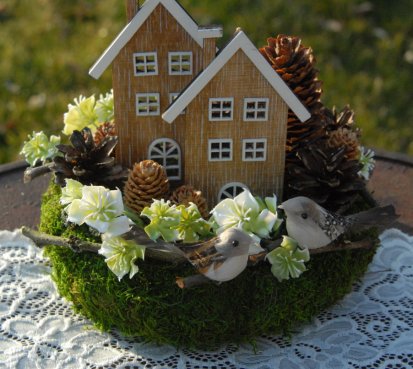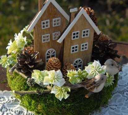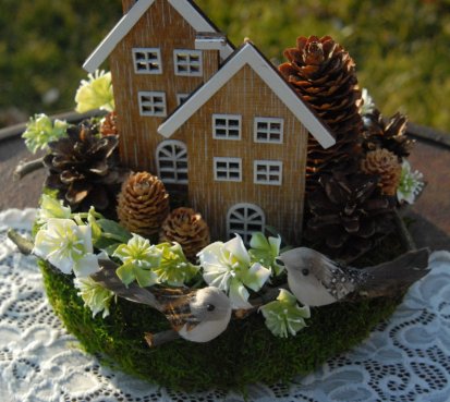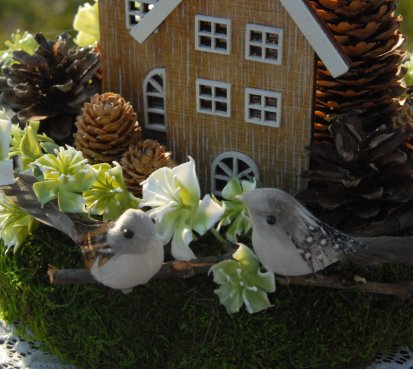 Dekorace je vytvořena na pevném podkladu z mechu a větviček, domečky jsou dřevěné....dva roztomilí ptáčkové k tomu