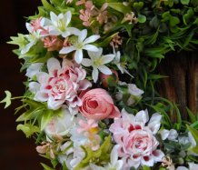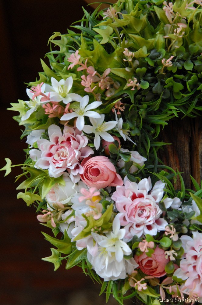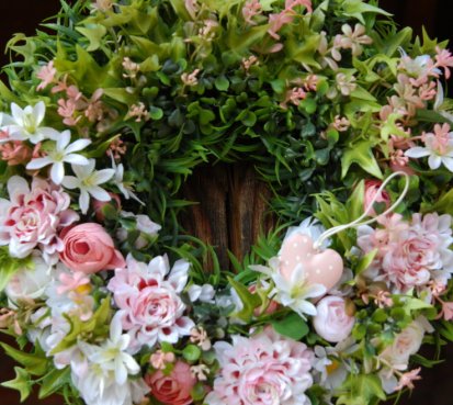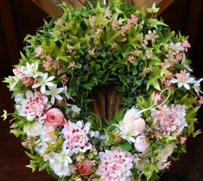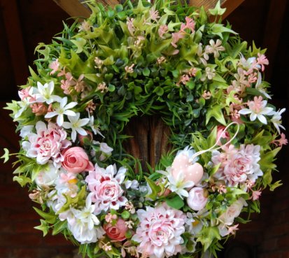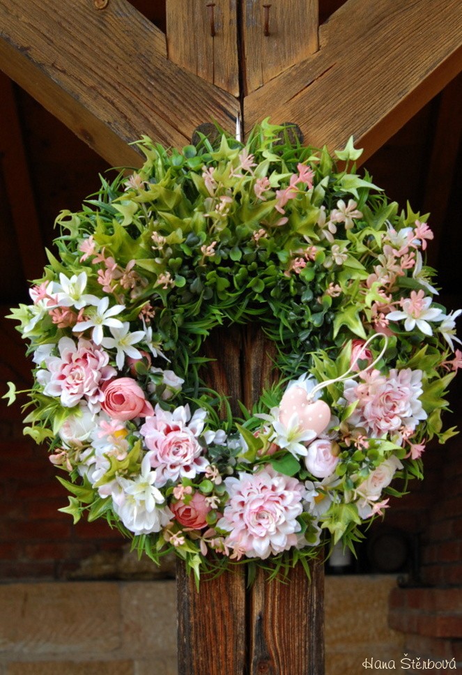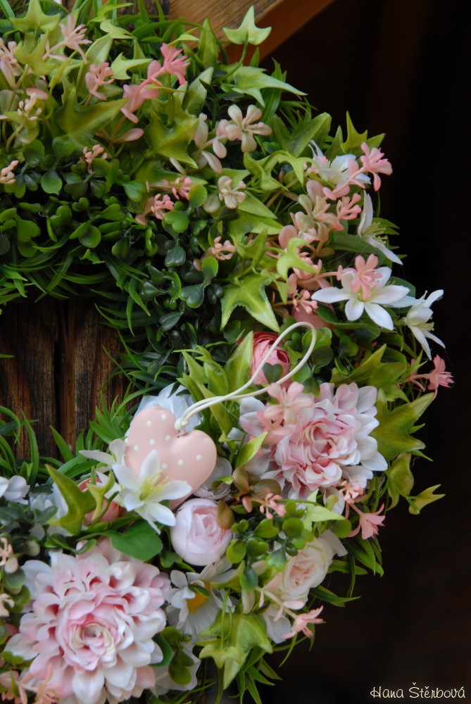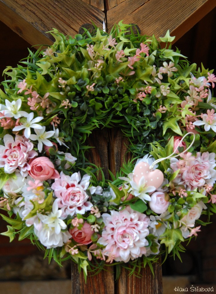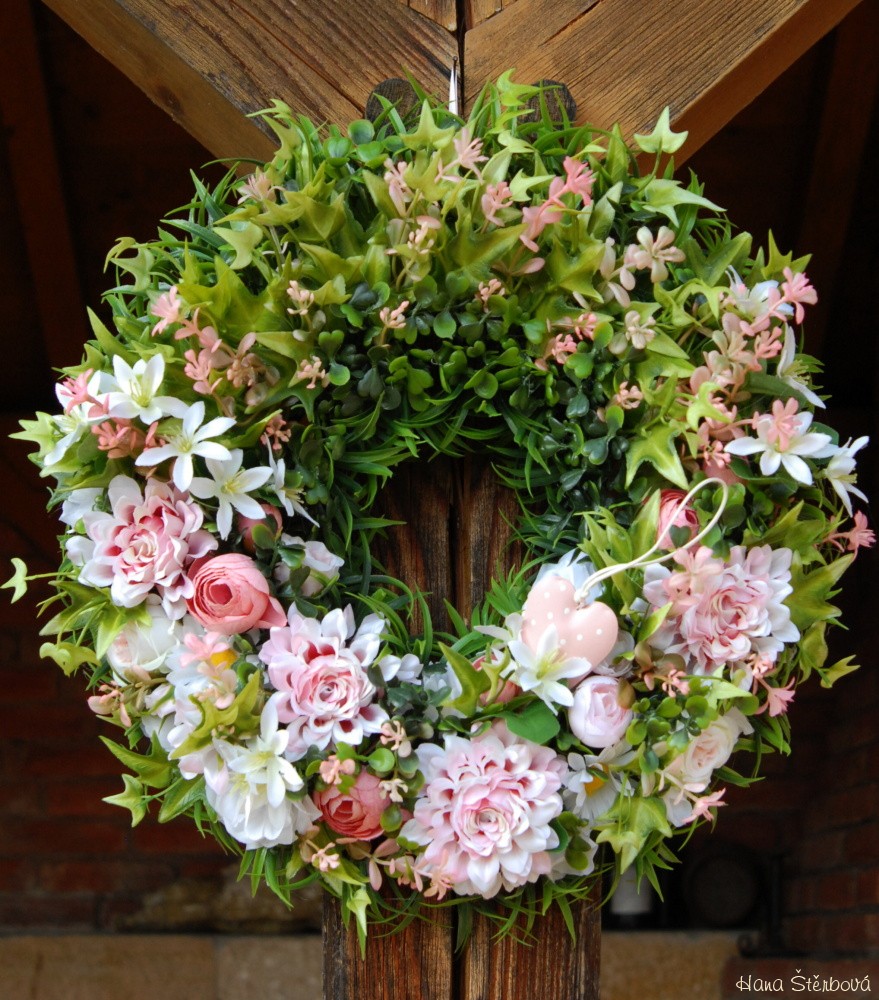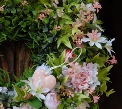 Bohatě zdobený věnec dokonalými umělými květinami a krásným plechovým srdíčkem