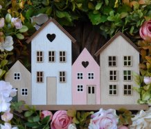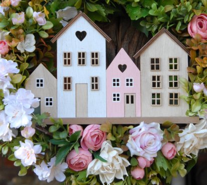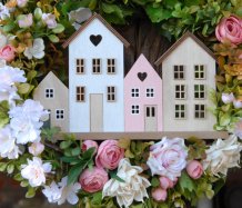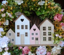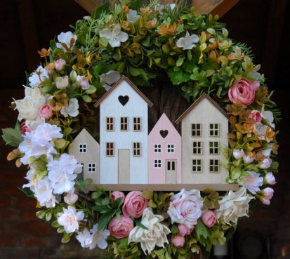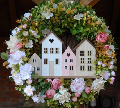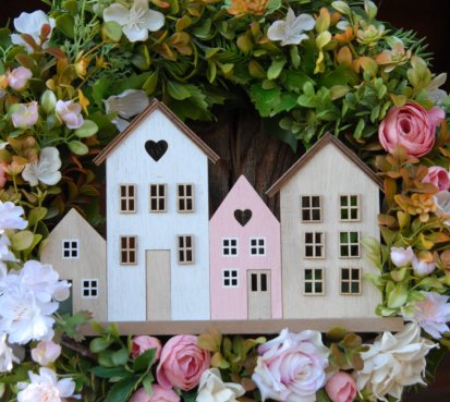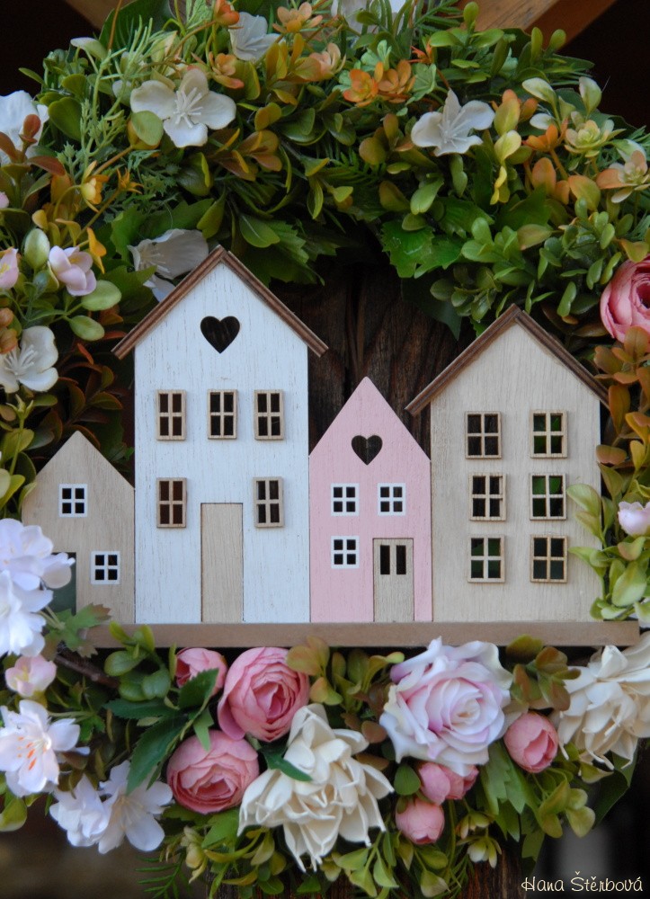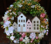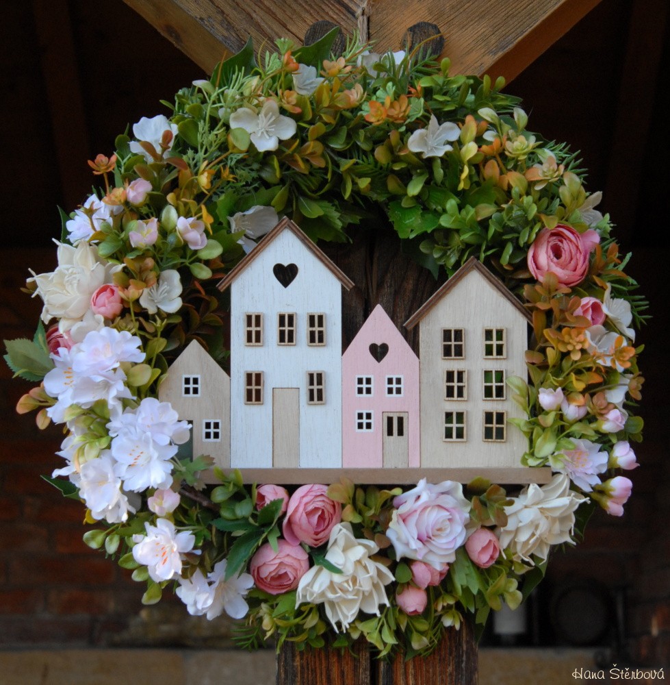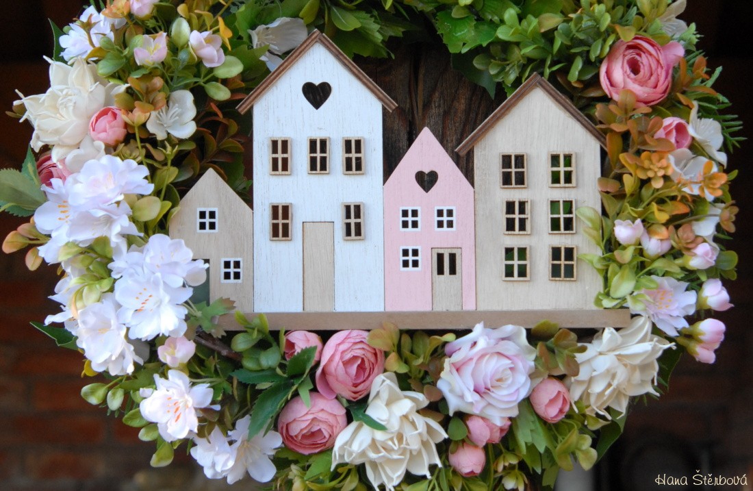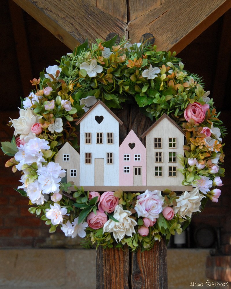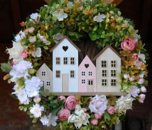 Veliký bohatě zdobený luxusní věnec dokonalými umělými květinami a krásným městečkem s dřevěnými domečky