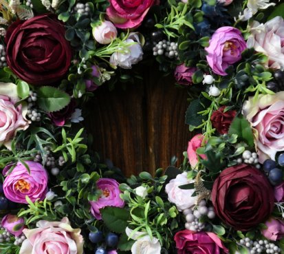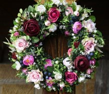 Věnec je vytvořen na pevném korpusu, ozdoben dokonalými umělými květinami