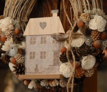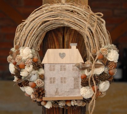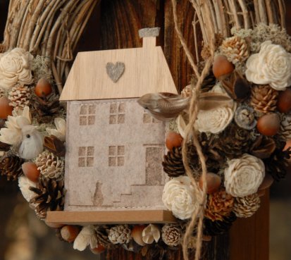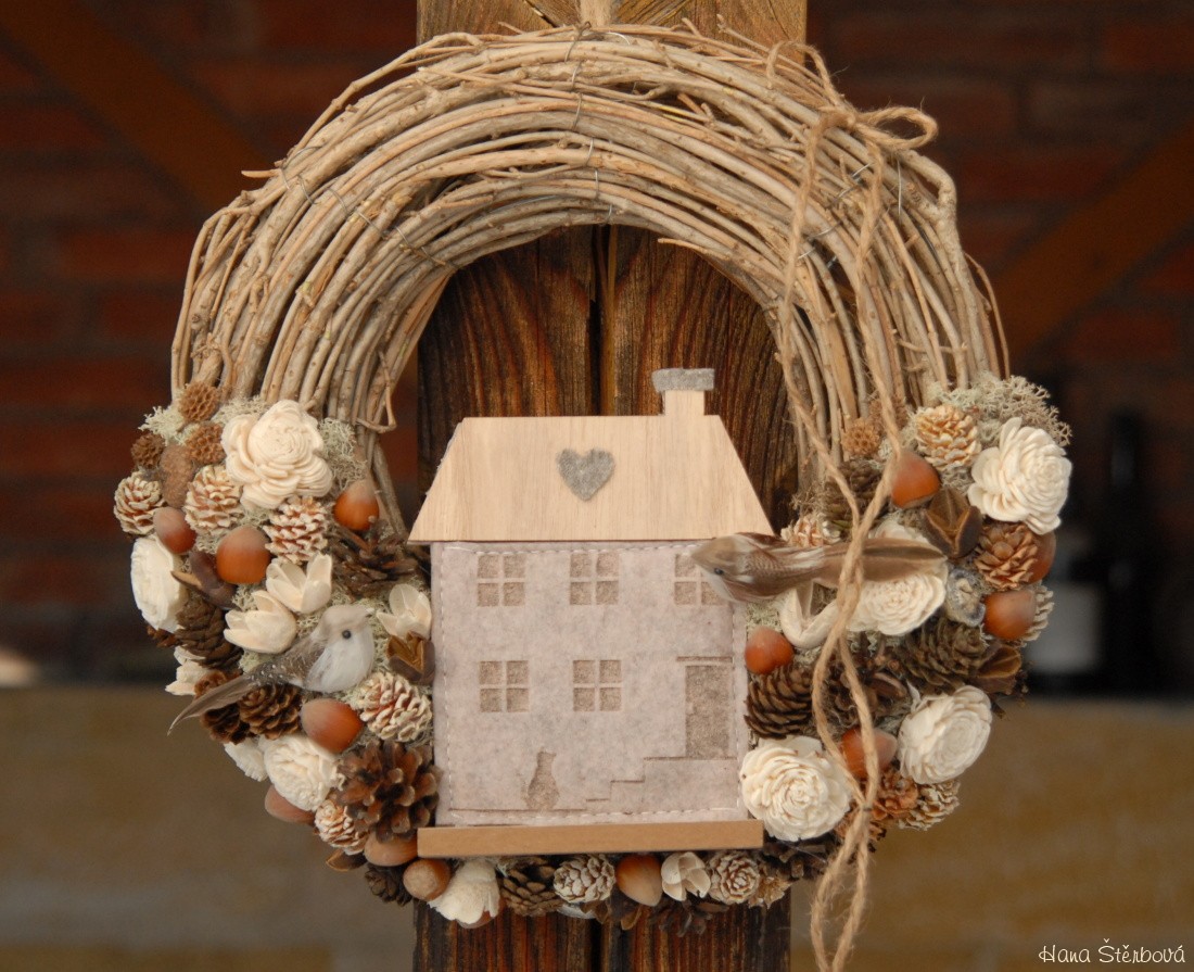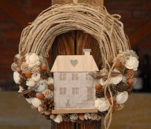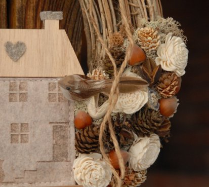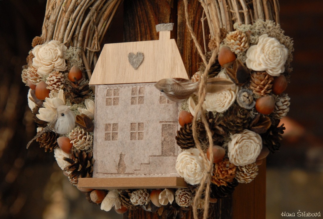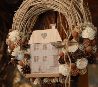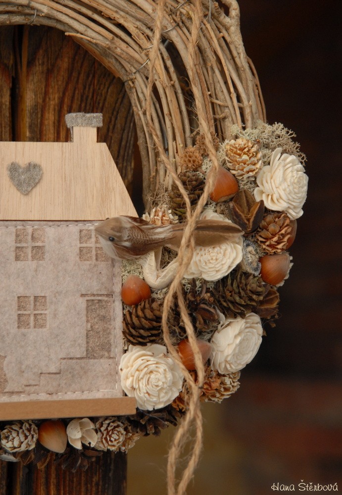 Věnec z proutí je nazdoben přírodninami a krásným domečkem a roztomilými ptáčky...