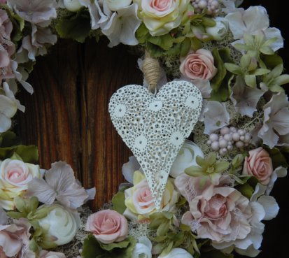 Mohutný veliký věnec na pevném podkladu s islandským lišejníkem a spoustou dokonalých umělých květin...a k tomu krásné plechové krajkové srdce