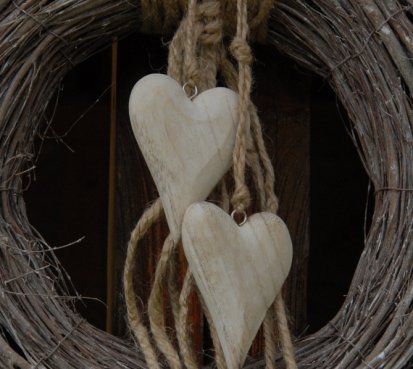 Veliký věnec je vytvořen z přírodního proutí, ozdoben dřevěnými srdíčky a mohutným provazem
