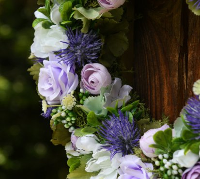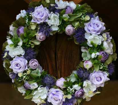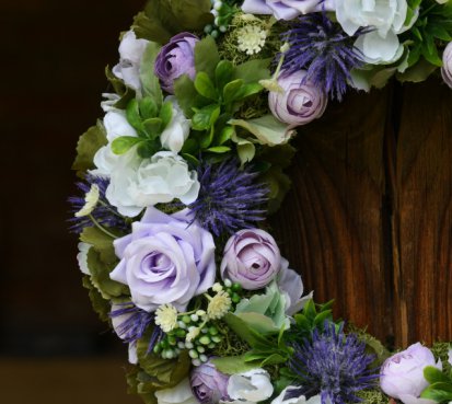 Romantický věnec na pevném korpusu s islandským lišejníkem je bohatě zdoben dokonalými umělými květinami