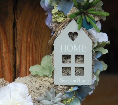 Hodně zdobený elegantní věnec s dokonalými umělými květinami a dřevěným domečkem bude krásnou dekorací ve Vašem interiéru