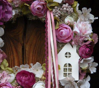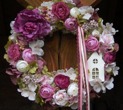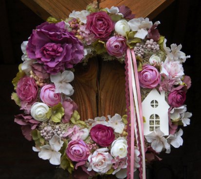 Veliký mohutný věnec na pevném slámovém korpusu s islandským lišejníkem...ozdoben dokonalými umělými květinami a plody....doplněn dřevěným domečkem