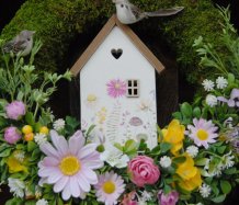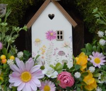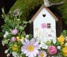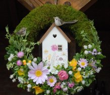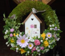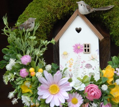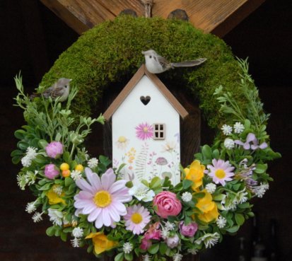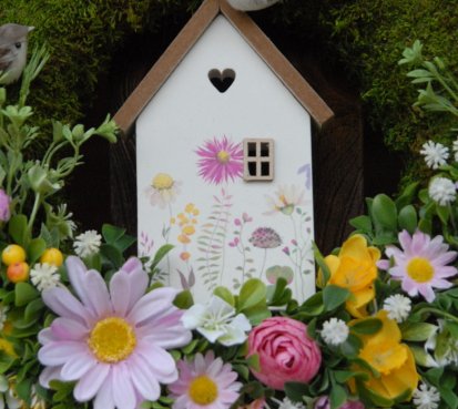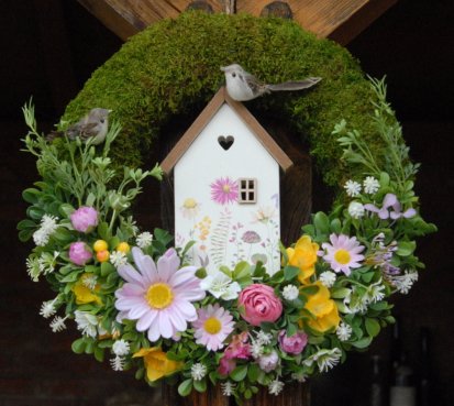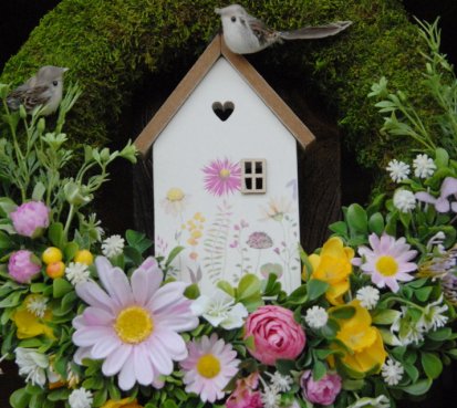 Věnec je vytvořen na pevném mechovém korpusu zdobený dokonalými umělými květinami s krásným dřevěným domečkem.....roztomilí ptáčci k tomu