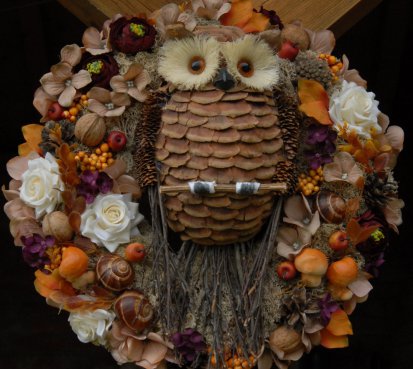 Velký mohutný věnec s dokonalými umělými květinami, plody, houbičkami, ulitkami..na vše dohlíží moudrá sova