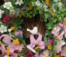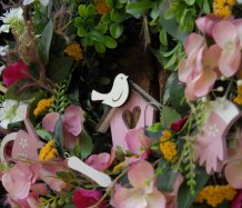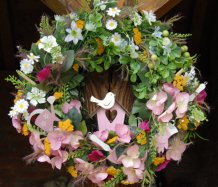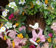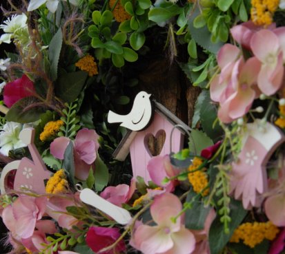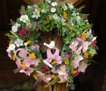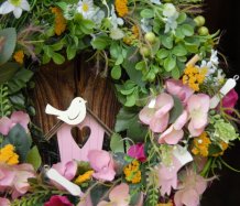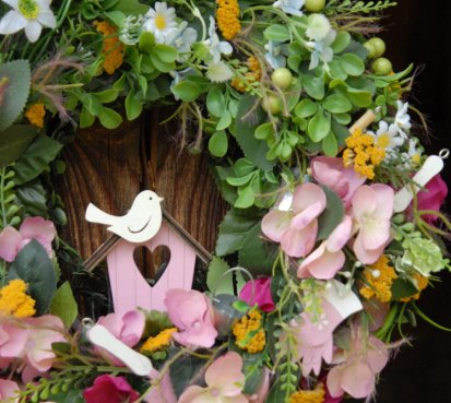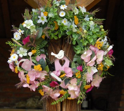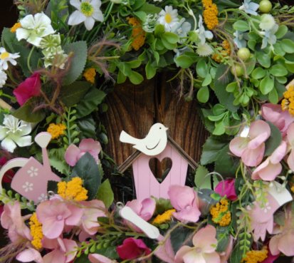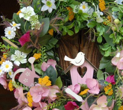 Bohatě zdobený věnec ze sušených a umělých květin....nářadí pro zahradníka k tomu..........Trvanlivá dekorace