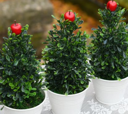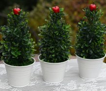 Roztomilý malý umělý stromeček je zasazen do bílého plechového květináčku