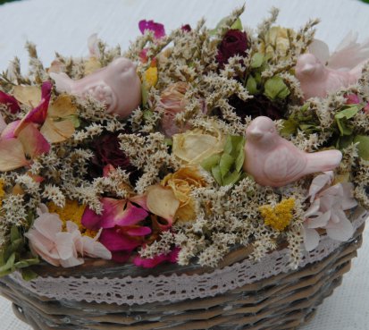 Sušené květiny jsou naaranžovány do jemně patinovaného košíku....na vše dohlížejí tři roztomilí ptáčkové