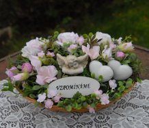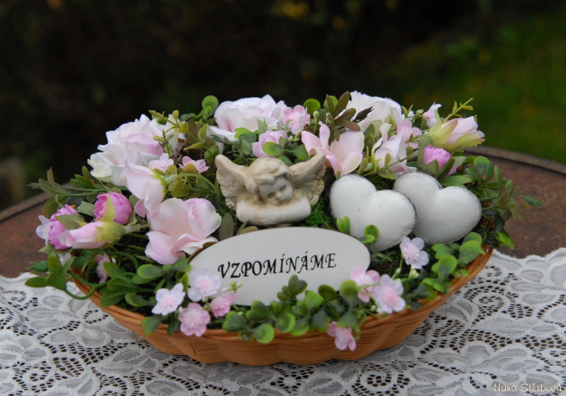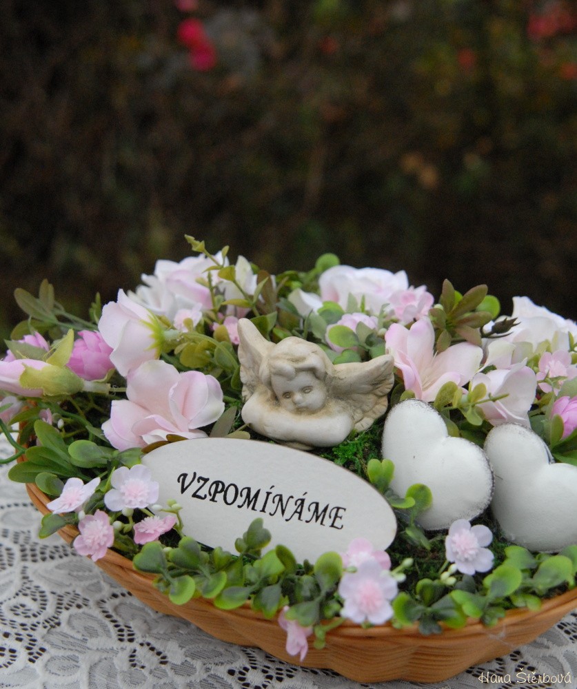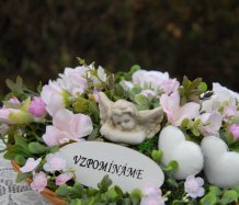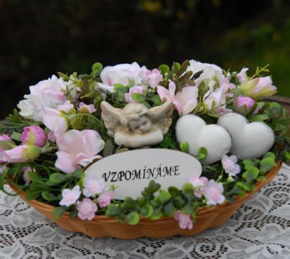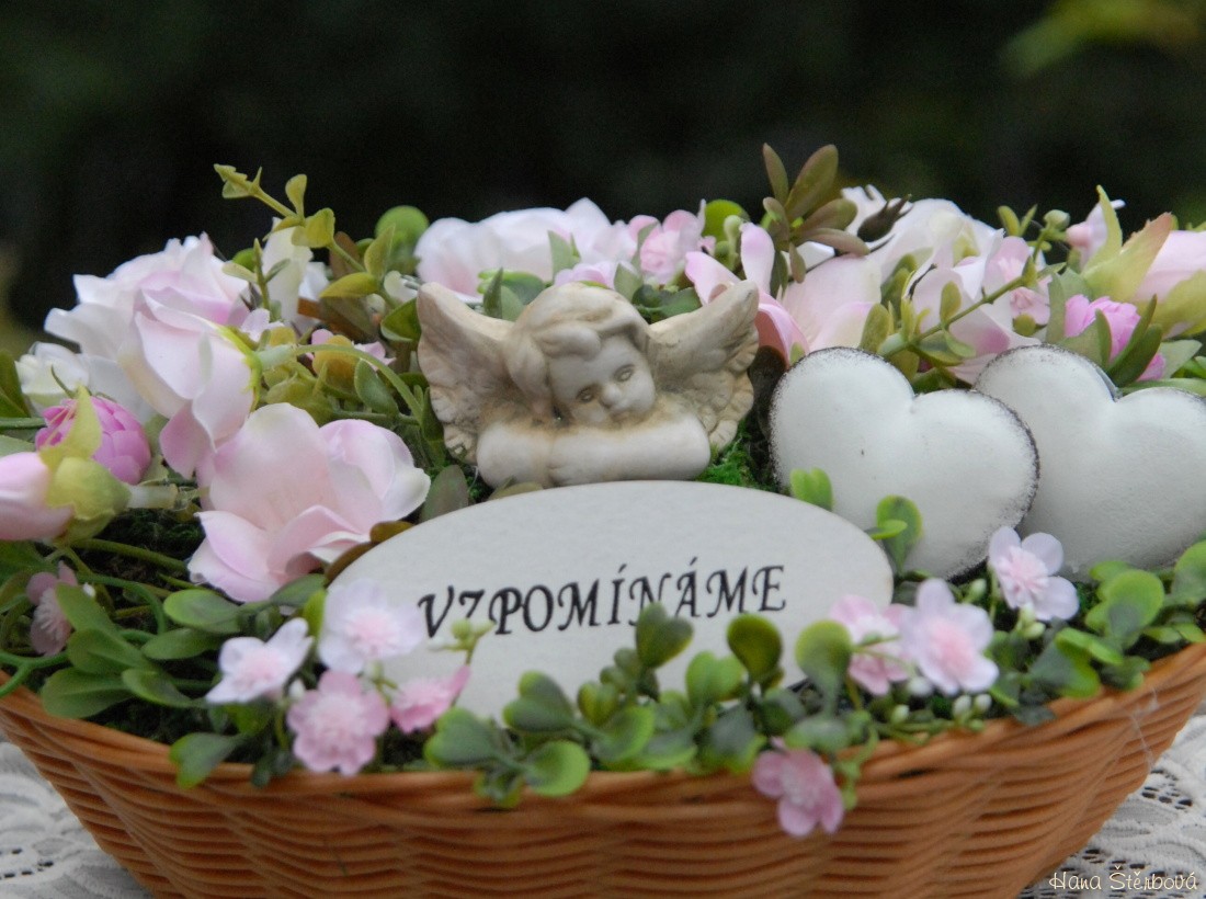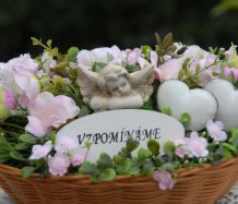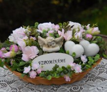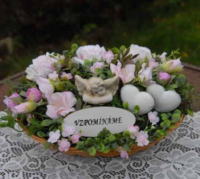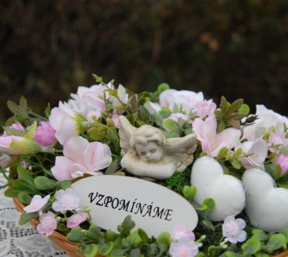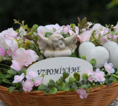 Jemná dekorace s krásným andílkem je vytvořena z dokonalých umělých květin, naaranžována do košíku...srdíčka jsou plechová