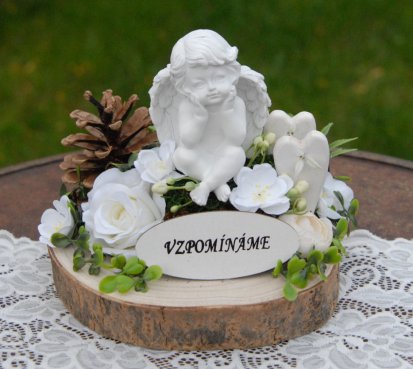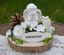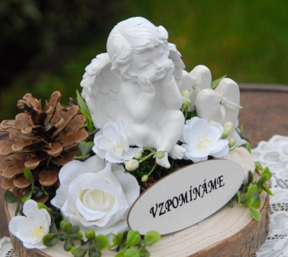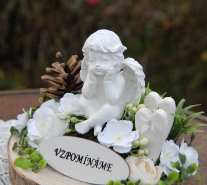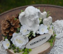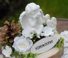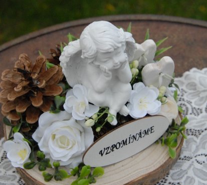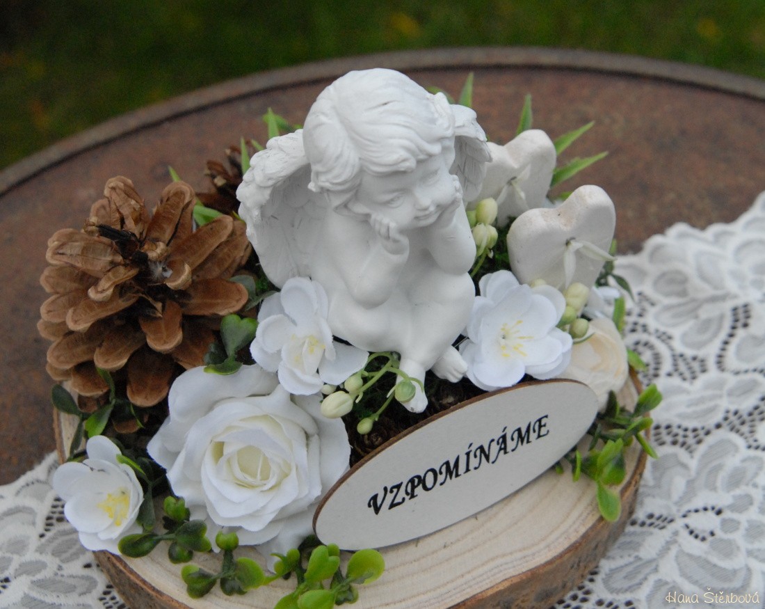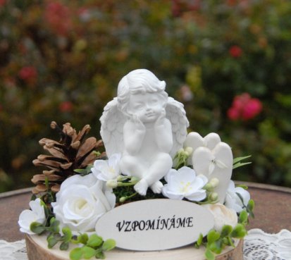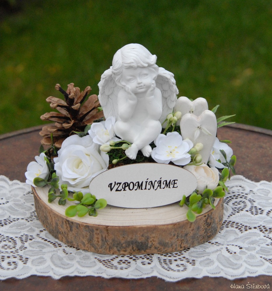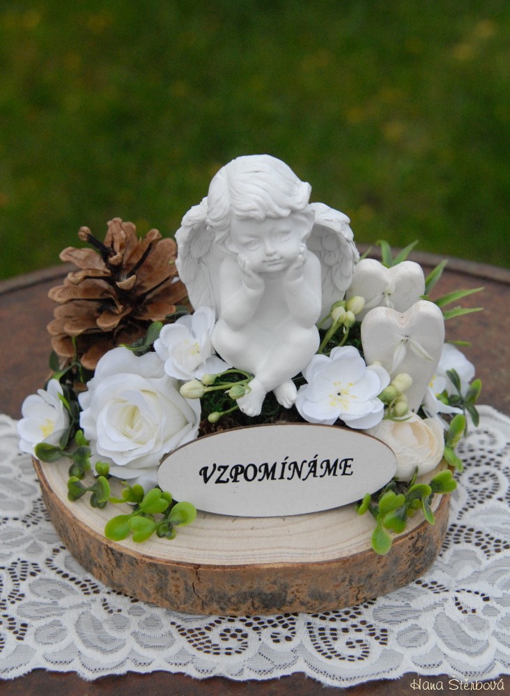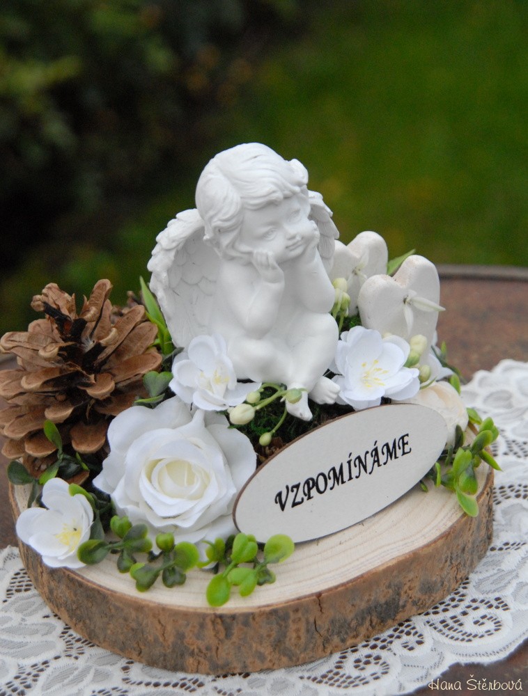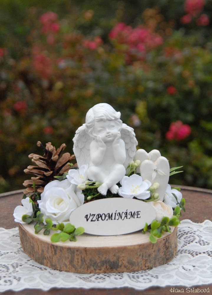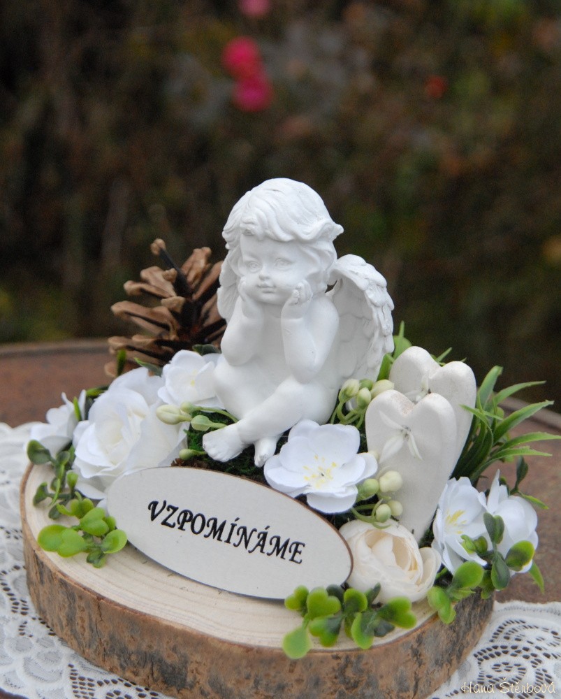 Jemná dušičková dekorace s krásným andělem a dokonalými umělými květinami a přírodninami