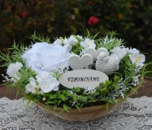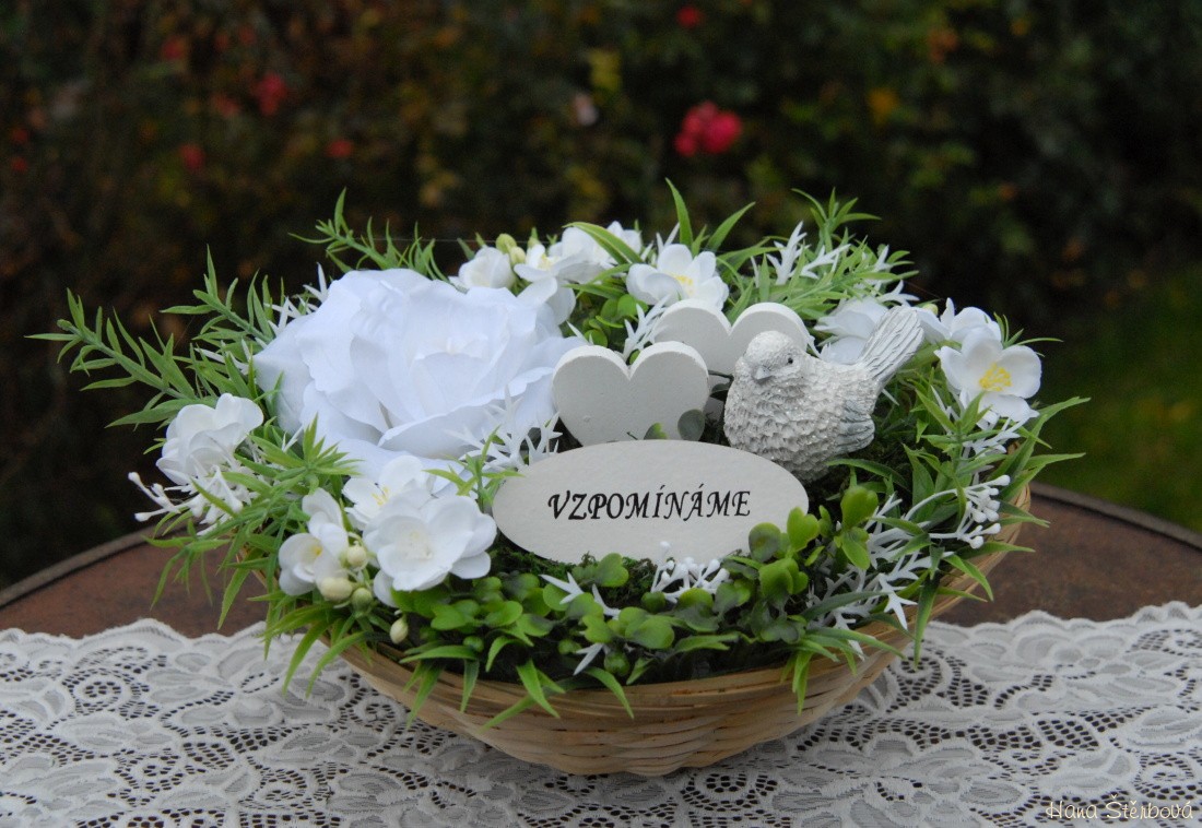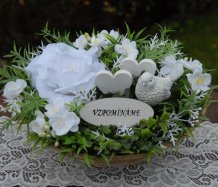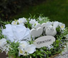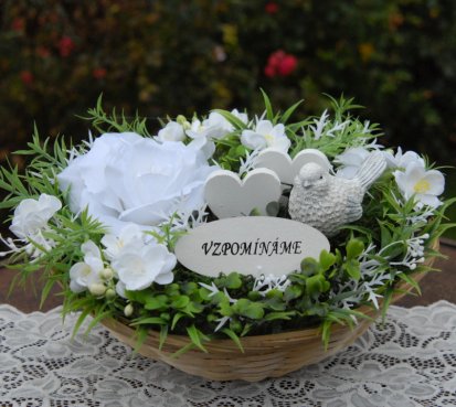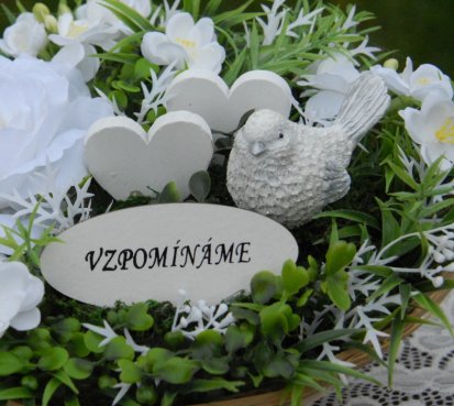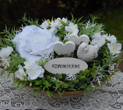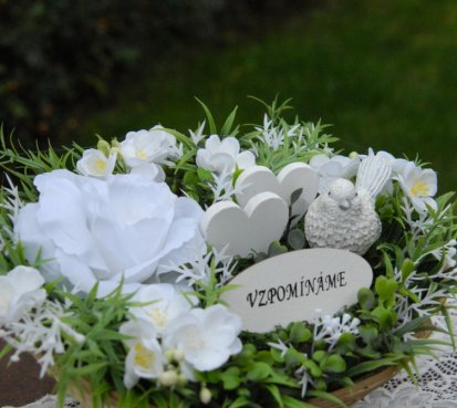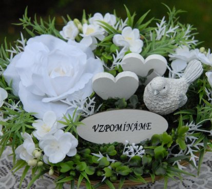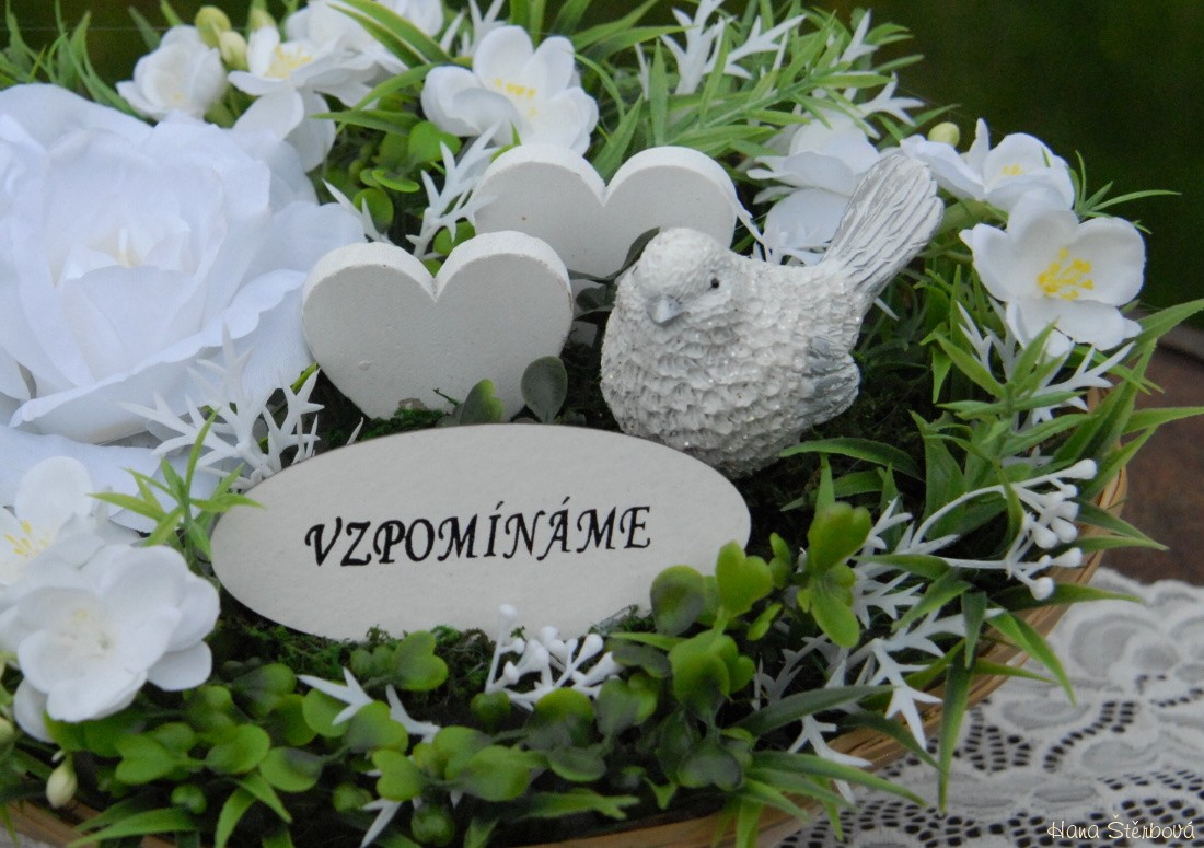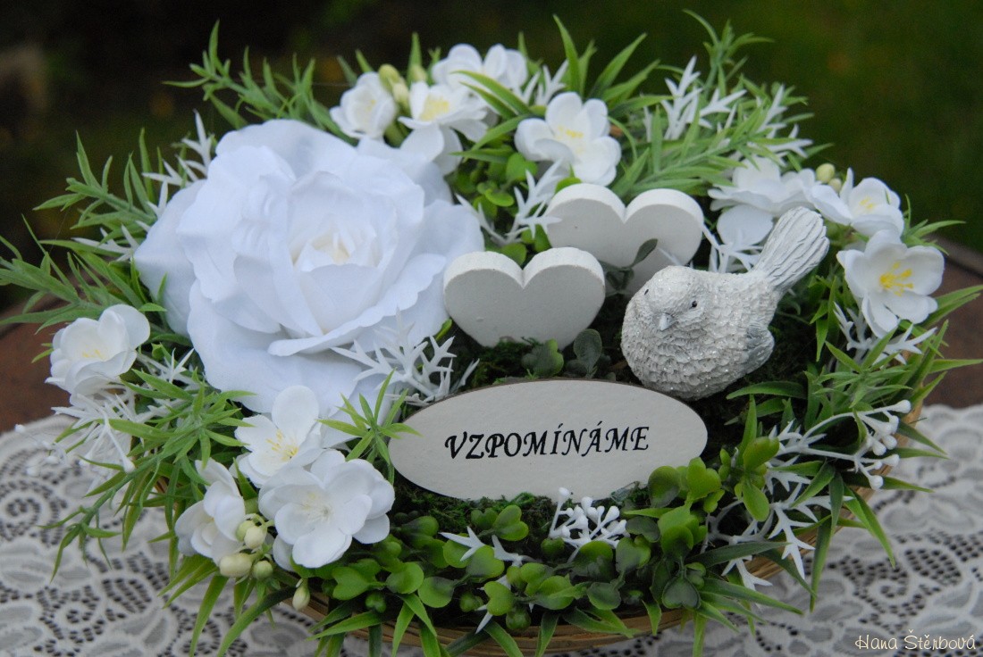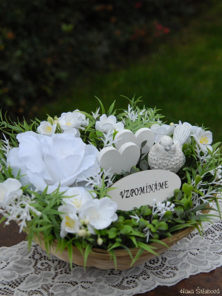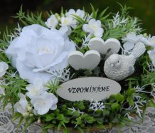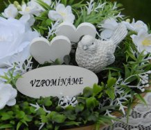 Jemně laděná smuteční dekorace z dokonalých umělých květin, srdíček...krásný ptáček k tomu