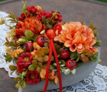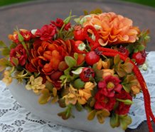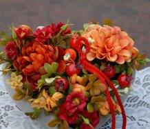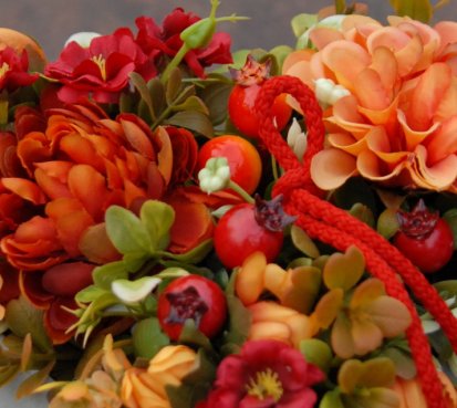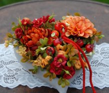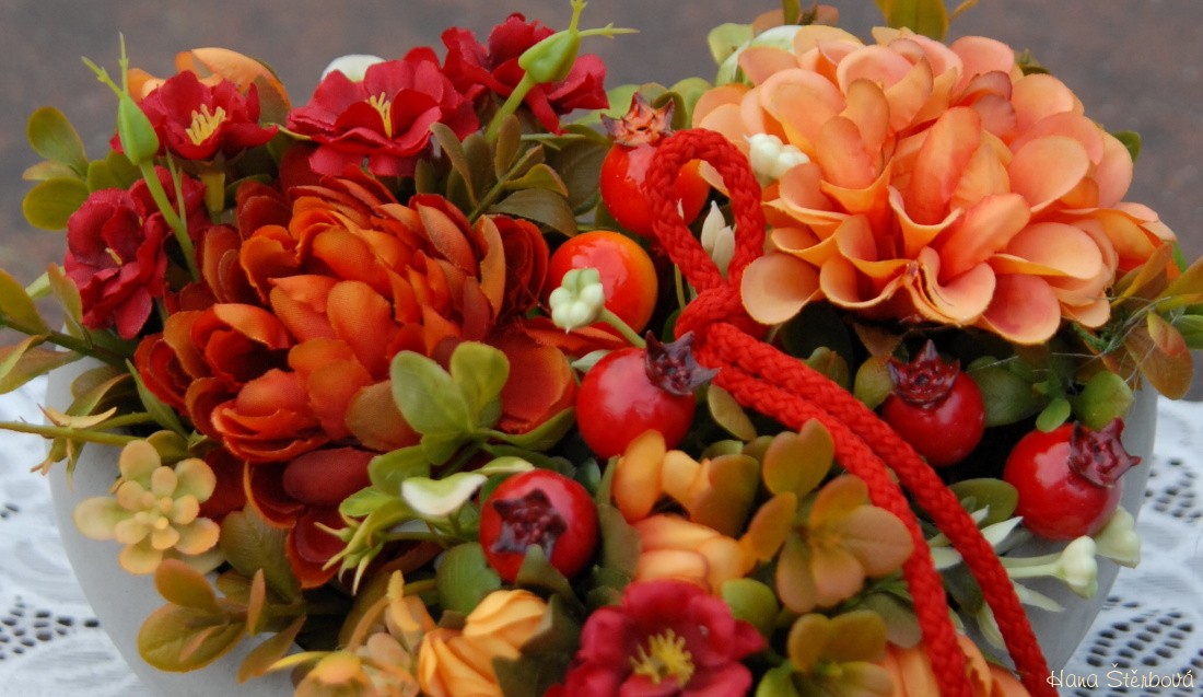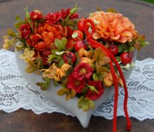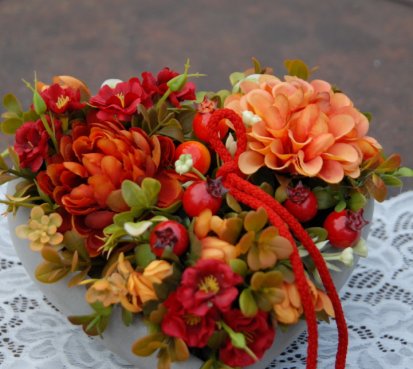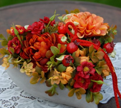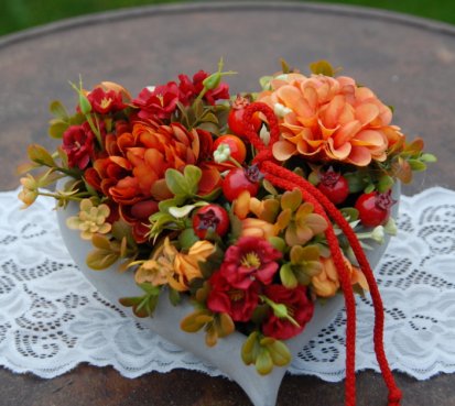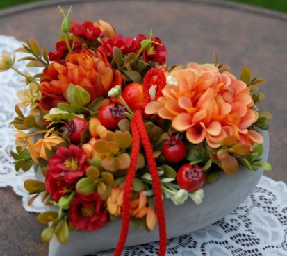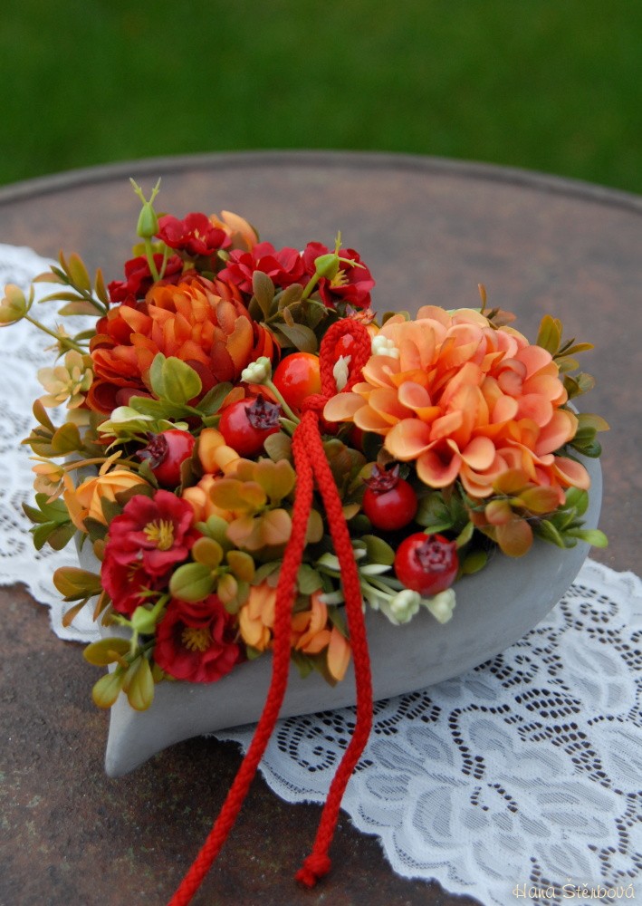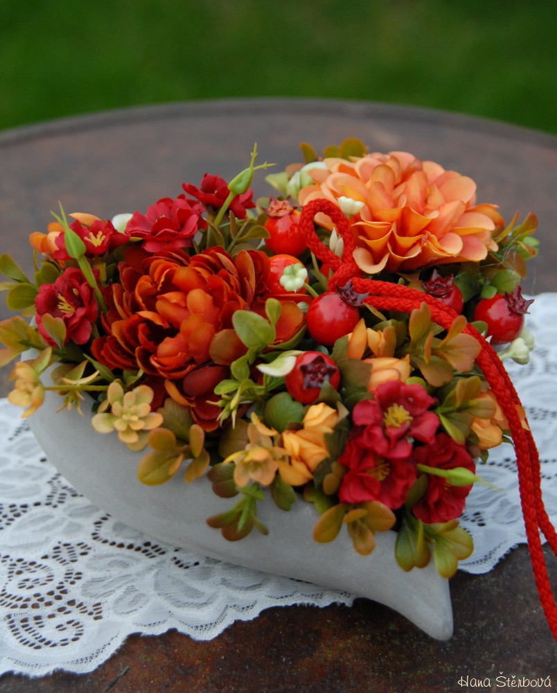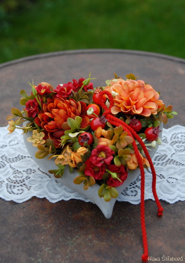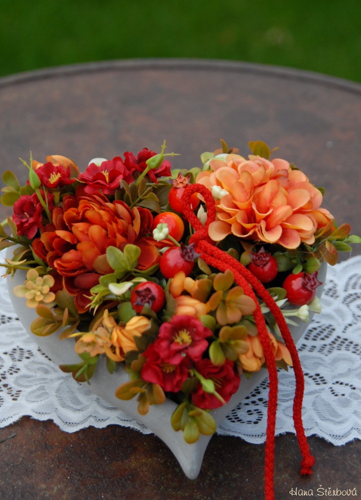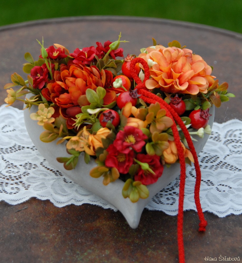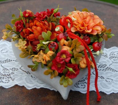 Betonové srdce je naaranžováno dokonalými umělými květinami
