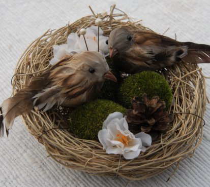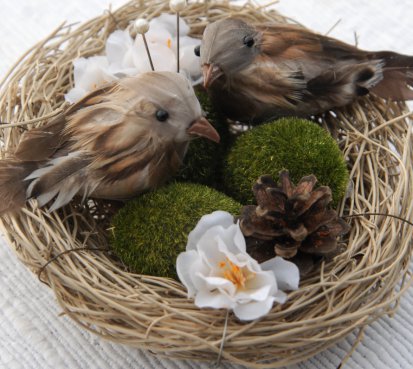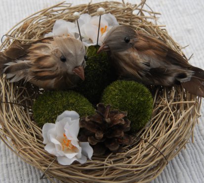 Hnízdečko z proutí se dvěma roztomilými ptáčky bude zajímavou dekorací pro vaše snubní prsteny