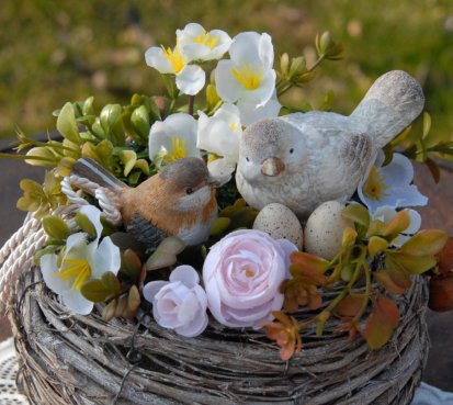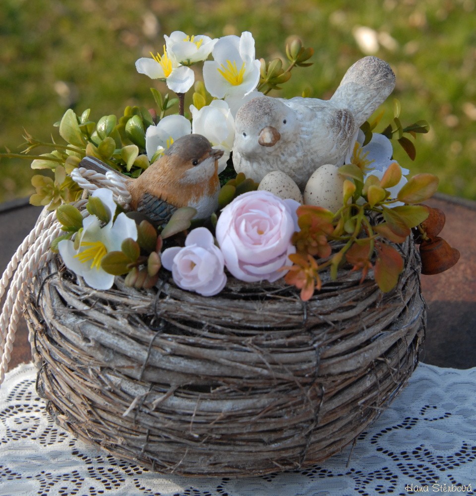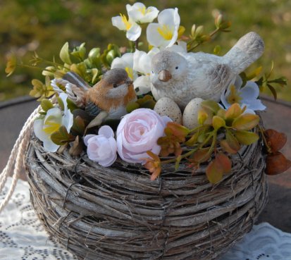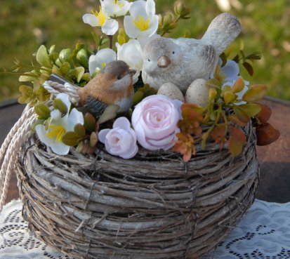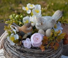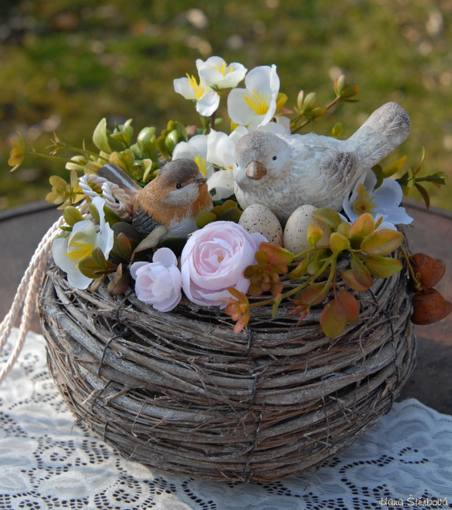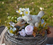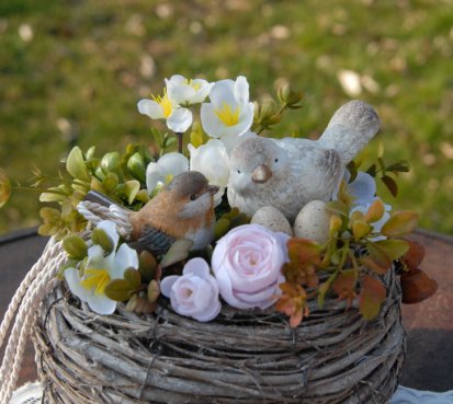 Proutěné hnízdo je naaranžováno dokonalými umělými květinami a krásnými ptáčky