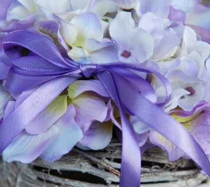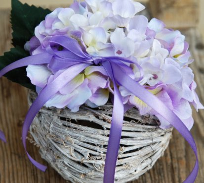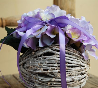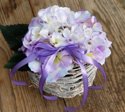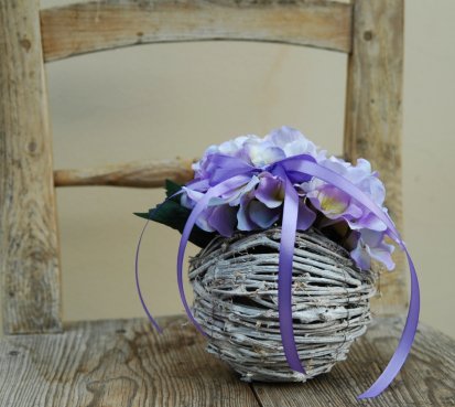 Látková hortenzie je naaranžována v proutěné kouli. Vydrží navěky.