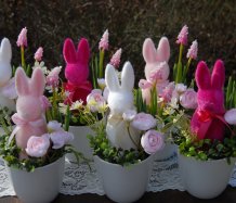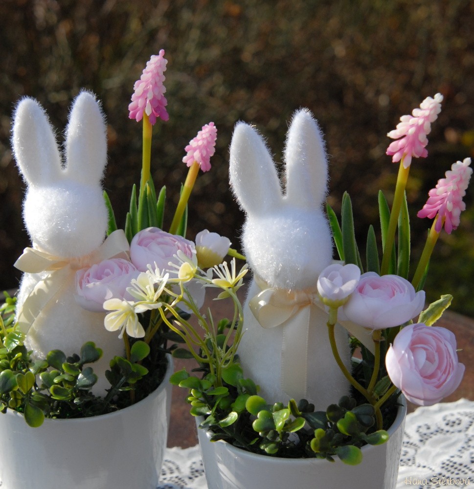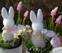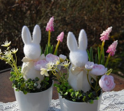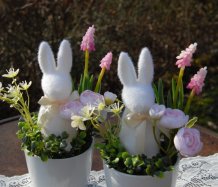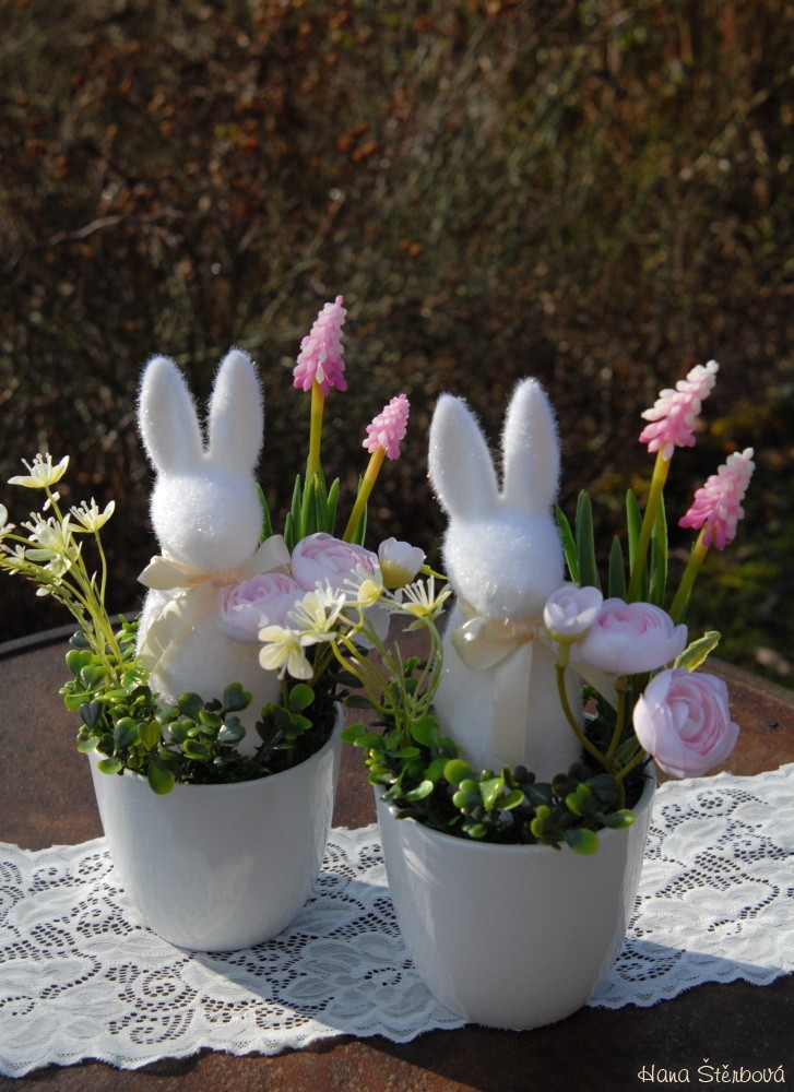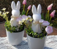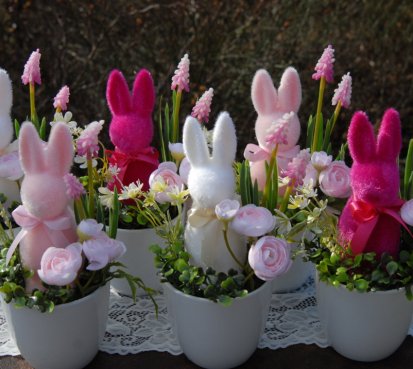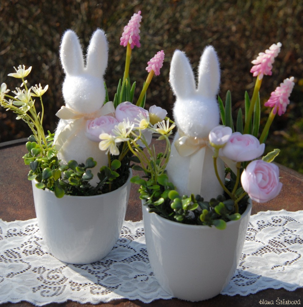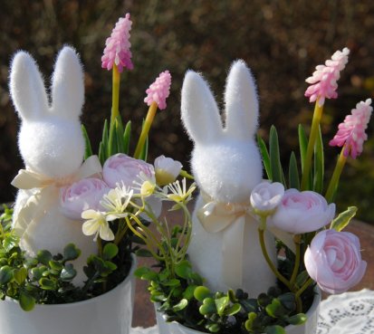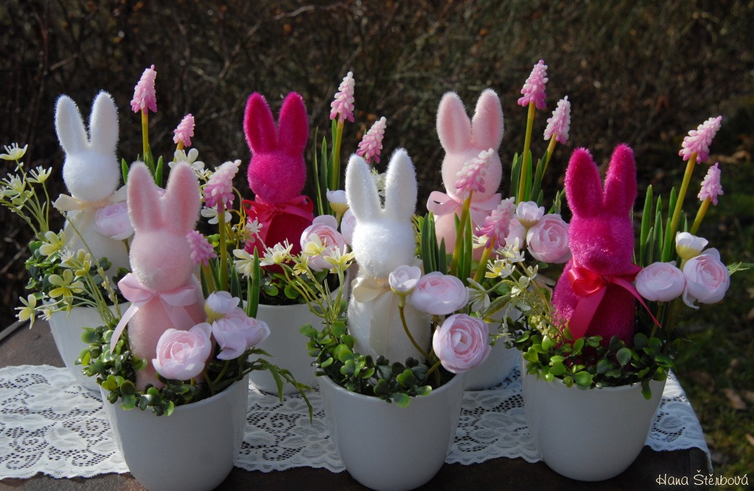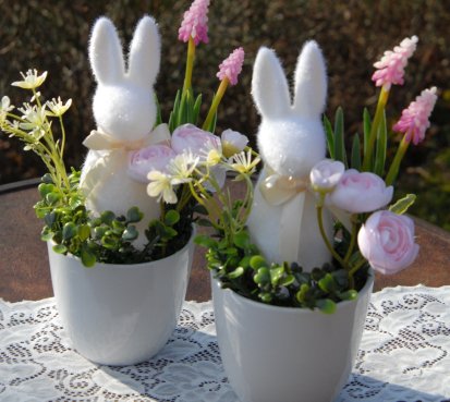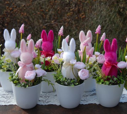 Krásný zajíček je umístěn do keramické nádoby, dozdoben dokonalými umělými květinami