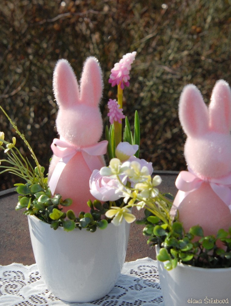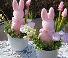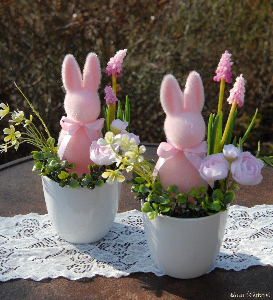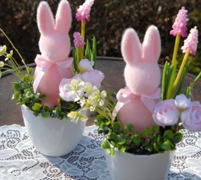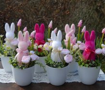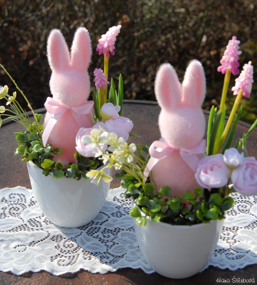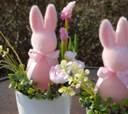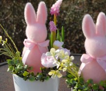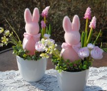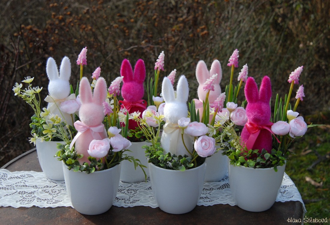 Krásný zajíček je umístěn do keramické nádoby, dozdoben dokonalými umělými květinami