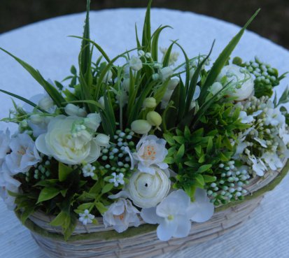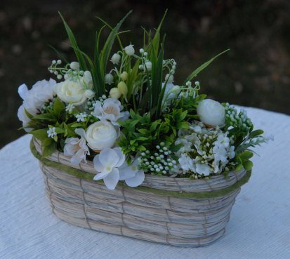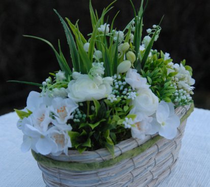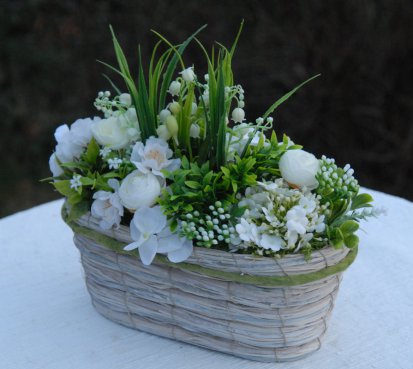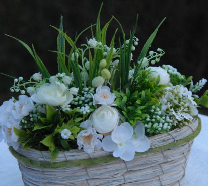 Dokonalé umělé květiny ve svěžích jarních barvách jsou naaranžovány do bílého košíku